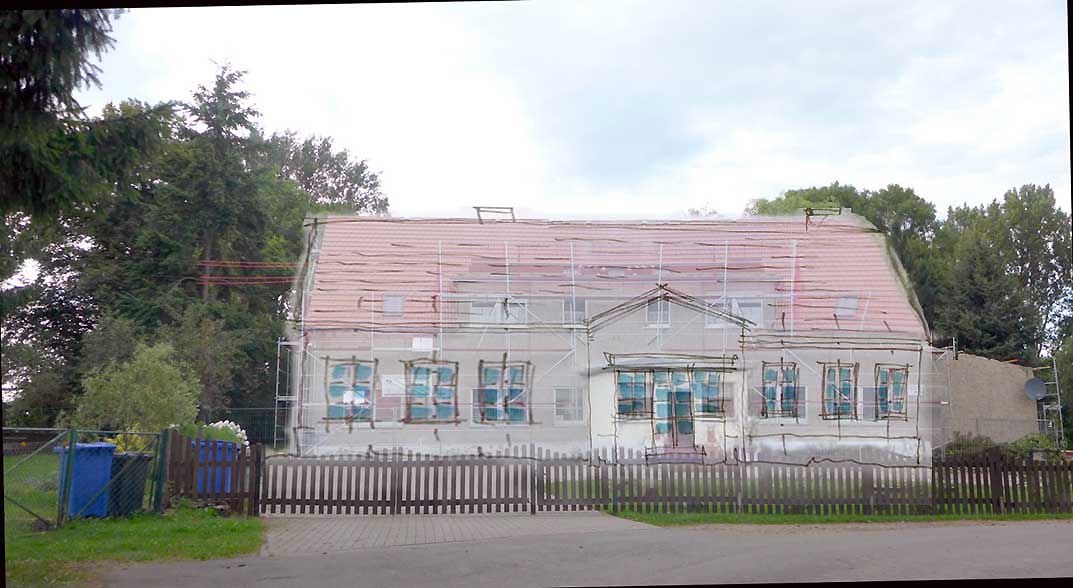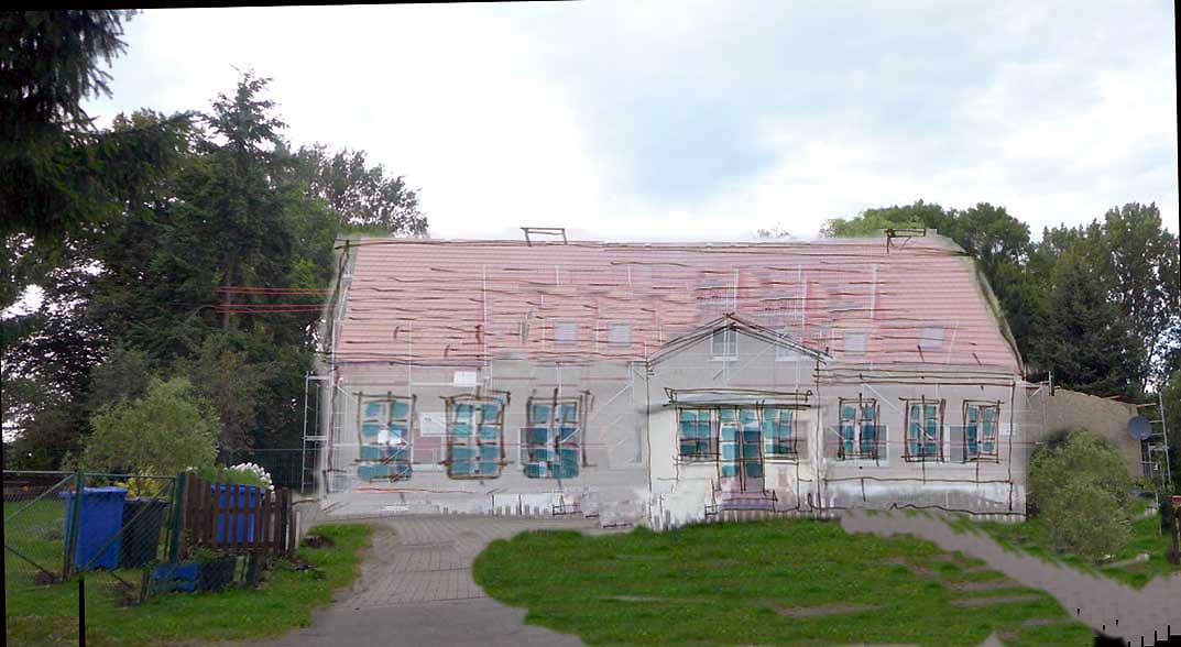 Umbau des Hauses nach dem hist. Gutshaus ohne Zaun, montiert jetziger Zustand mit Konzept Bau übereinandergelegt