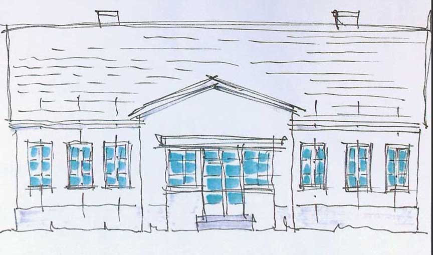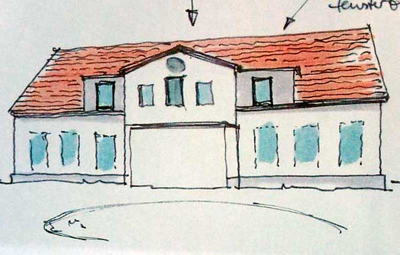 Ein Entwurf des Hauses auf der Basis 30er Jahre-Gliederungen mit freundlicher Auffahrt, der die Gesamtheit des Hofes auslässt.