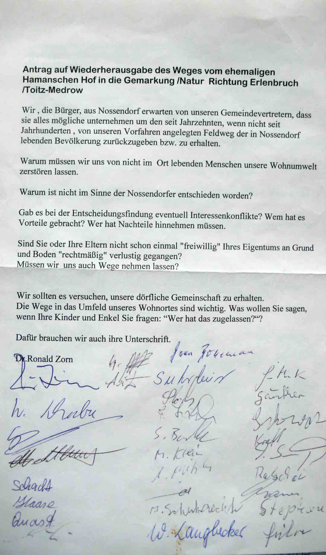 das Unterpflügen des Feldes -also des Weges hier- ist illegal. 5 Meter ab Grabenkante verboten nach Auskunft des Miniseriums in Schwerin. Der Antrag zur Wiederherstellung an die Gemeinde zur Durchführung wird vorbereitet. Die Bürgerinitiative zeigt den Bürgerwillen des Ortes.