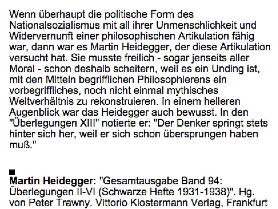 Das Vermächtnis Heideggers ist heute in allen Blättern und in den Lüften lebendig. Der stille Mann mit seinen Bildern, entmündigt und verfolgt, ist ihnen nun dienlich auf wundersame Weise. Selbst dem gestohlenen Nachlass der armen Schwester des tapferen Vaters. Ein Ort -ferne den AtomMächten- gefunden ihrer zu gedenken. Vom Scheitern eine andere schöne Geschichte.
