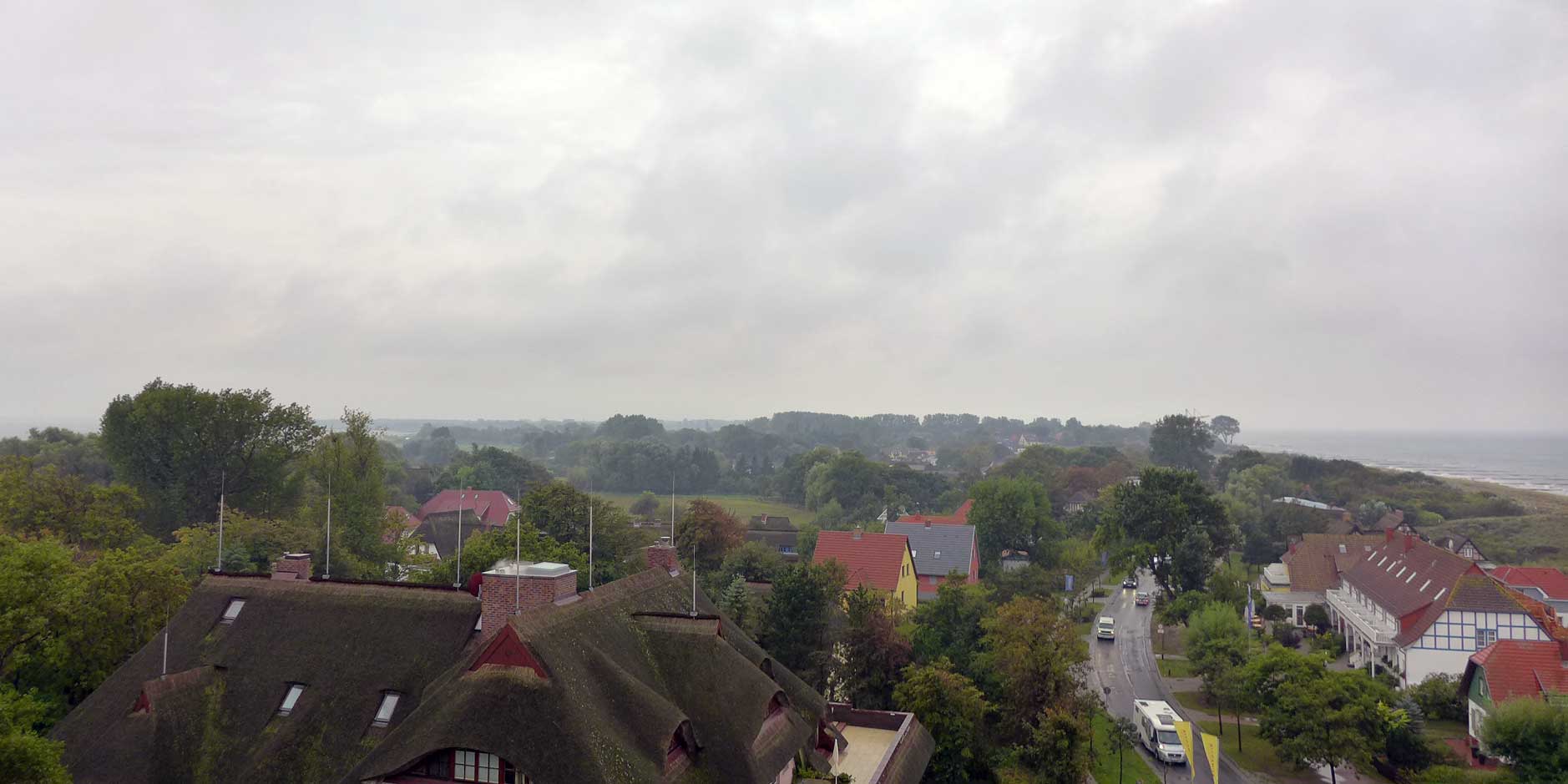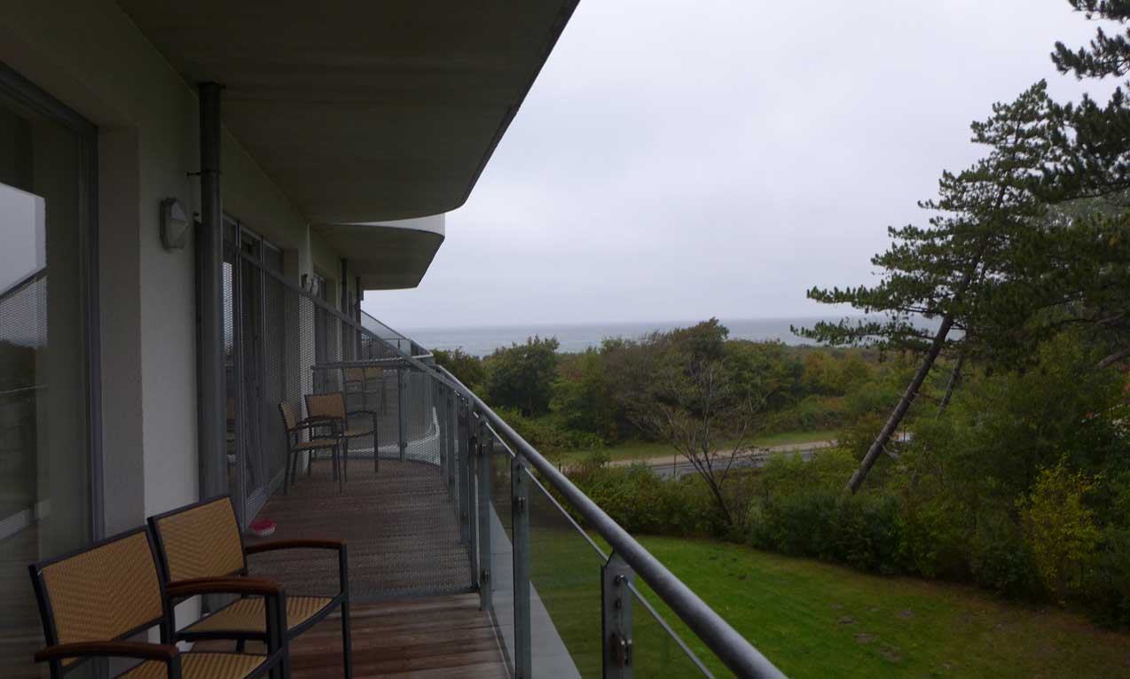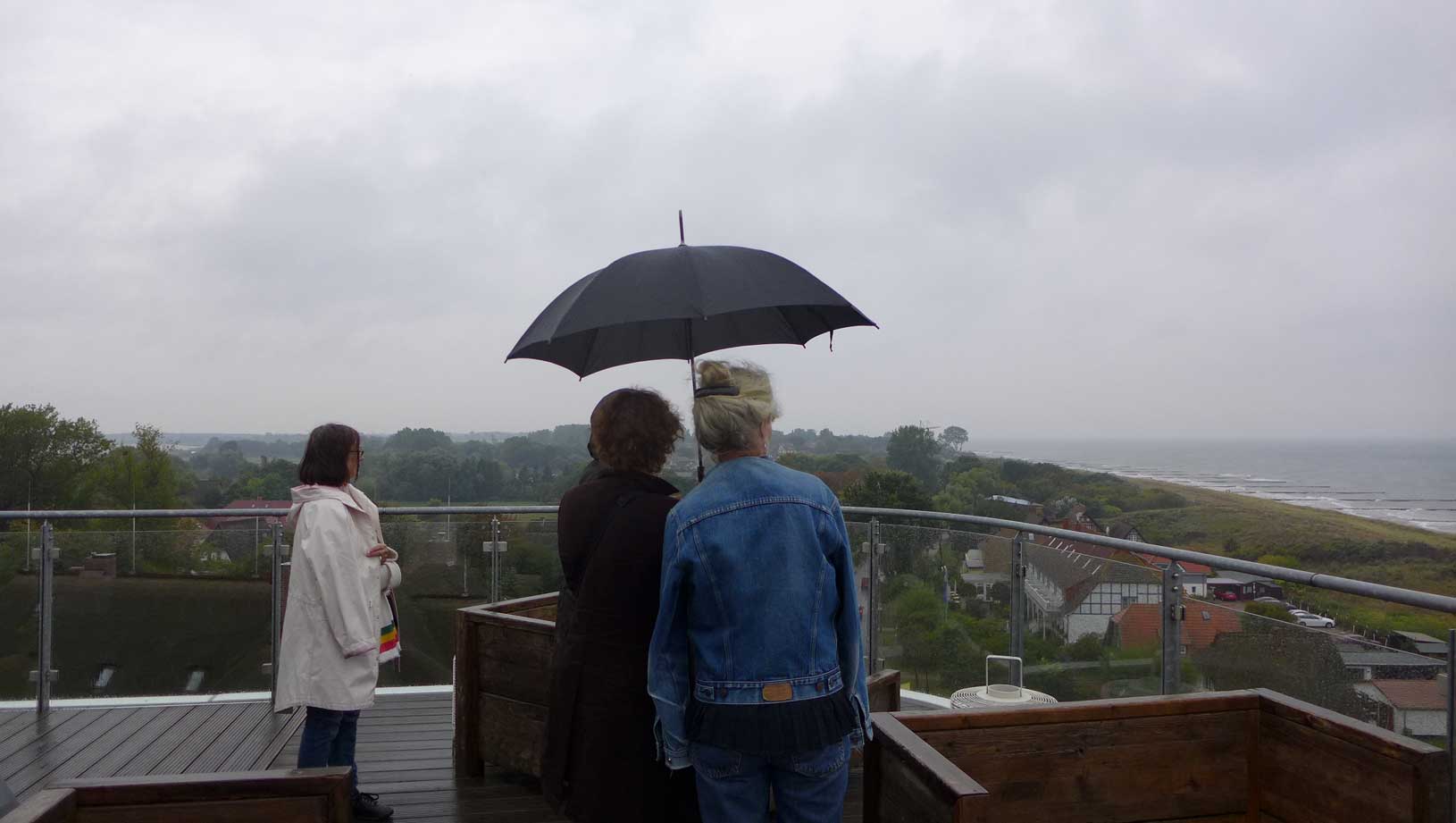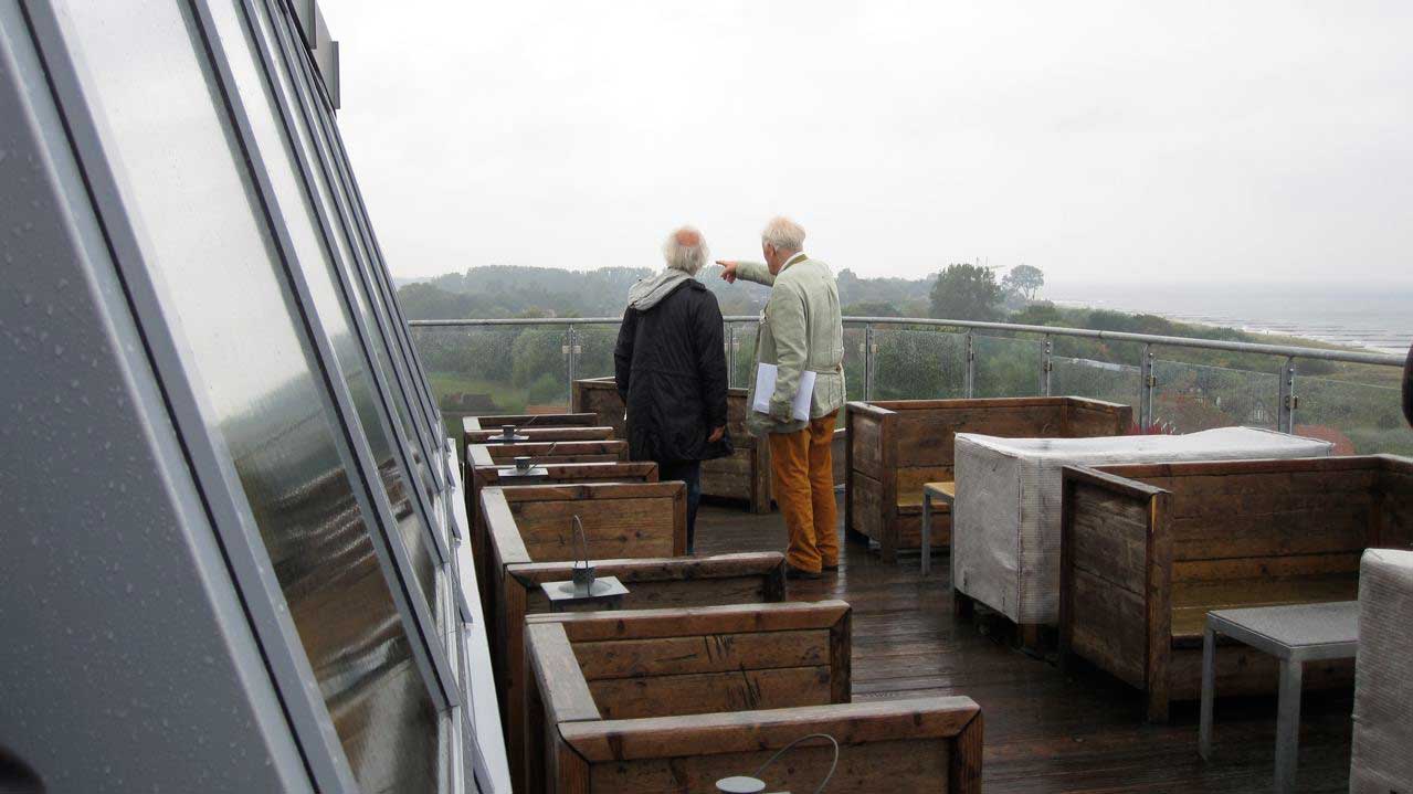 und aber dann auf den Dach-Terrassen der Blick vom Bodden des Innenwassers zur offenen Ostsee und dazwischen der Ort, wir. Von oben.