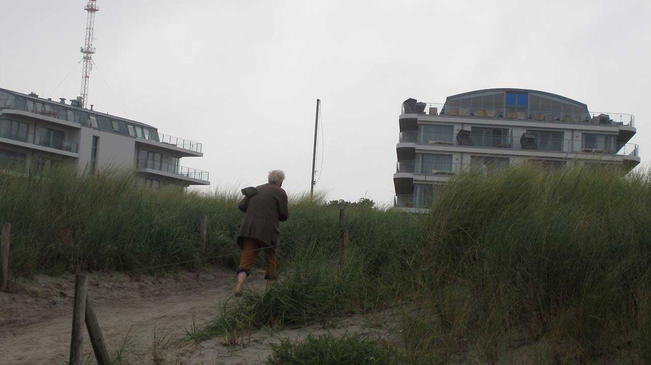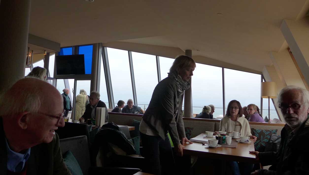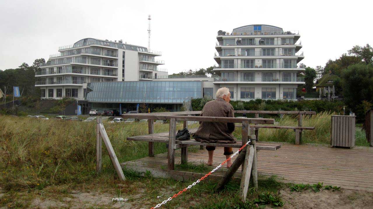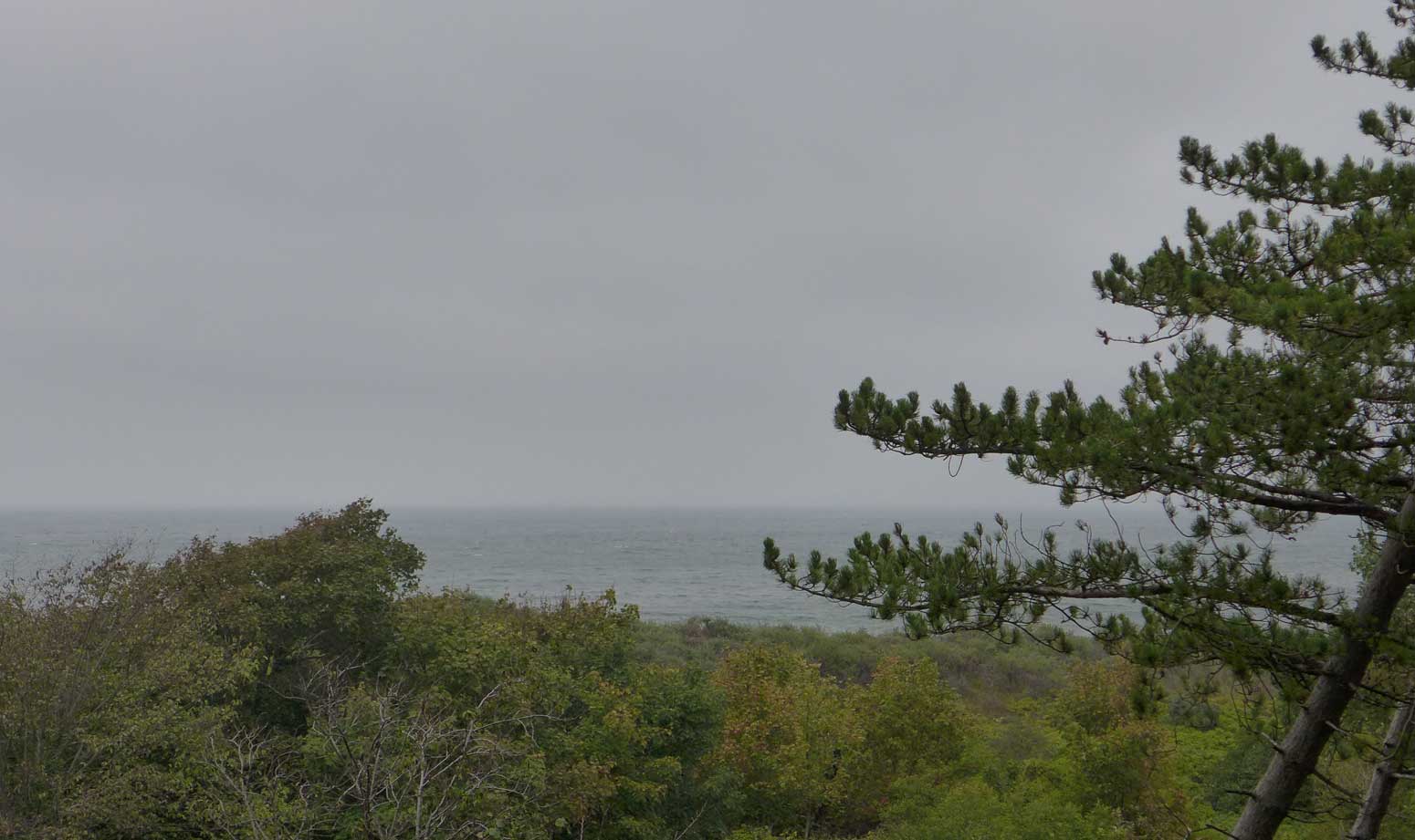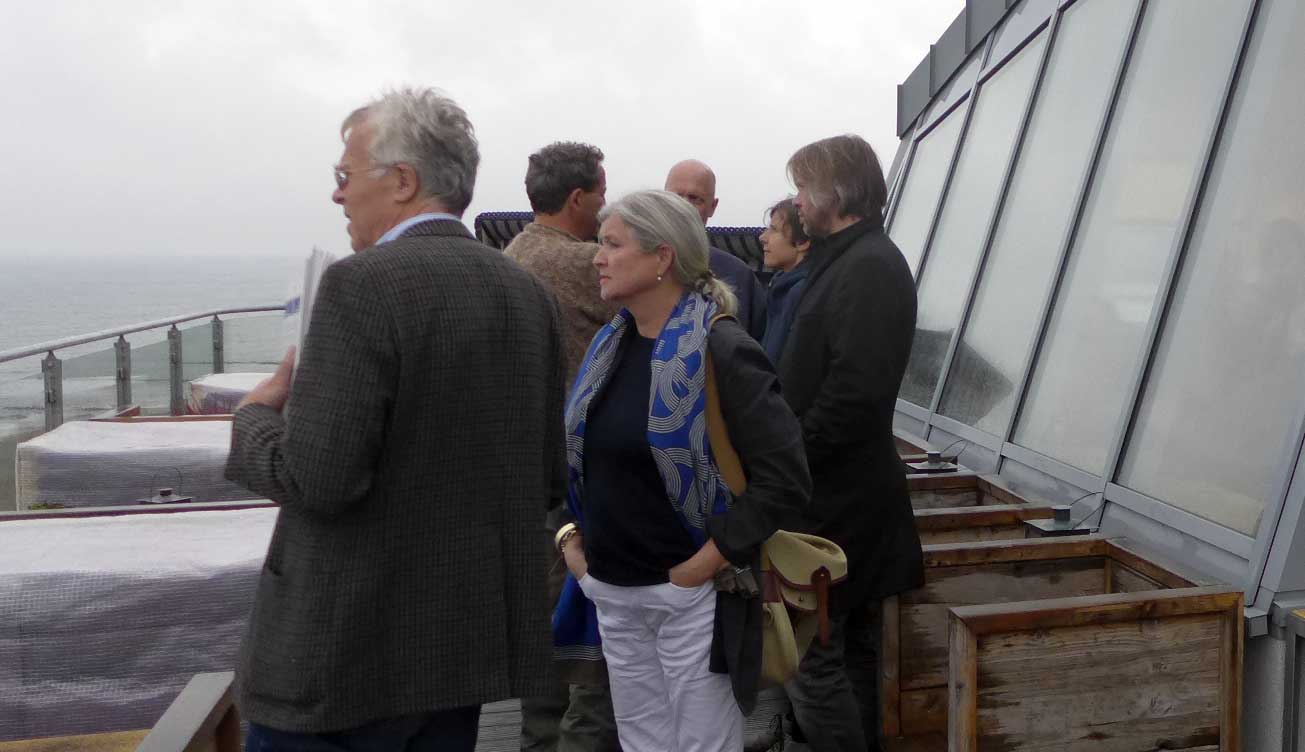 und aber dann auf den Dach-Terrassen der Blick vom Bodden des Innenwassers zur offenen Ostsee und dazwischen der Ort, wir. Von oben.
