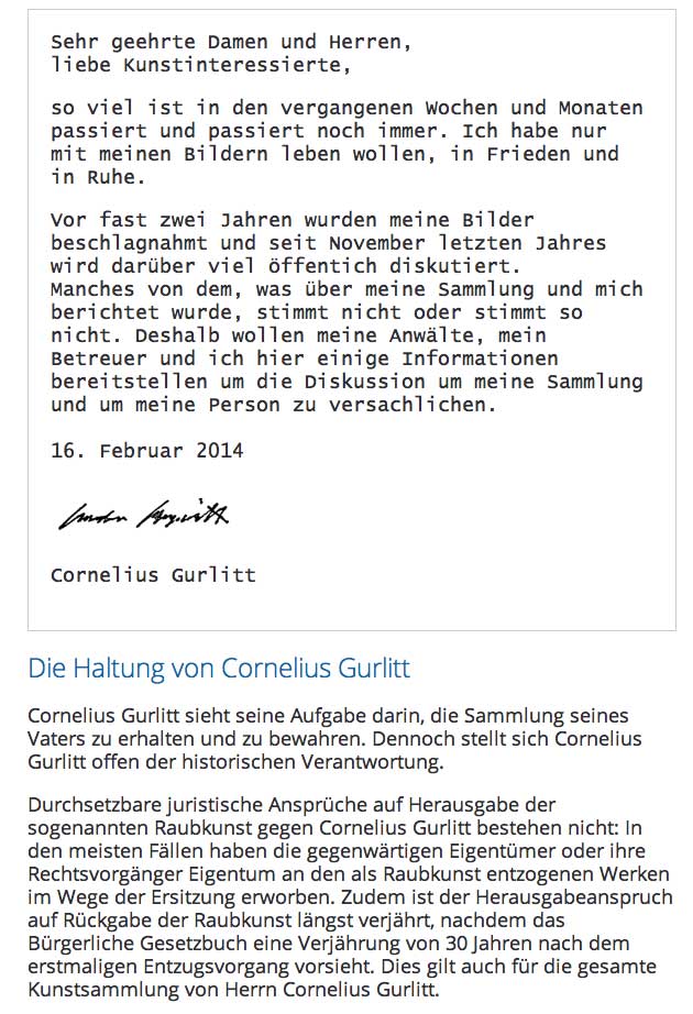 die Erklärung auf der sogen. Webseite des C.Gurlitt erscheint unter einen Porträt im Werbedesign von Leuten, die uns was verkaufen wollen, das die Kälte des Vorgangs dokumentiert.Und auch die Unterschrift wird nicht die sein, die notariell beglaubigt als Signatur des darüberstehenden Textes gelten wird.
