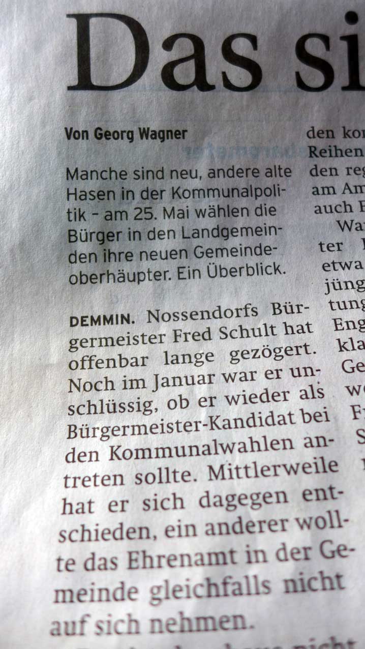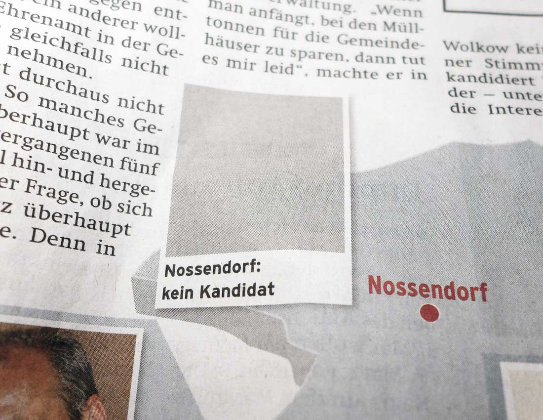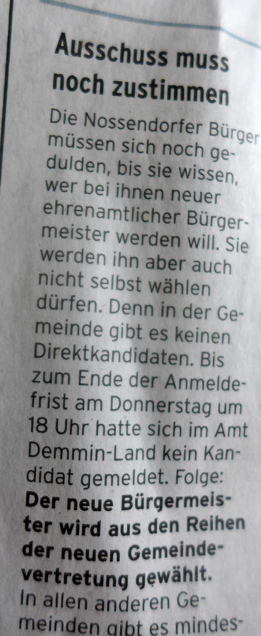 Von 19 Gemeinden im Amtsbezirk Demmin Land tritt allein nur in Nossendorf kein Kandidat als Bürgermeister zur Wahl an am 25. Mai. Der bisherige ist weg.