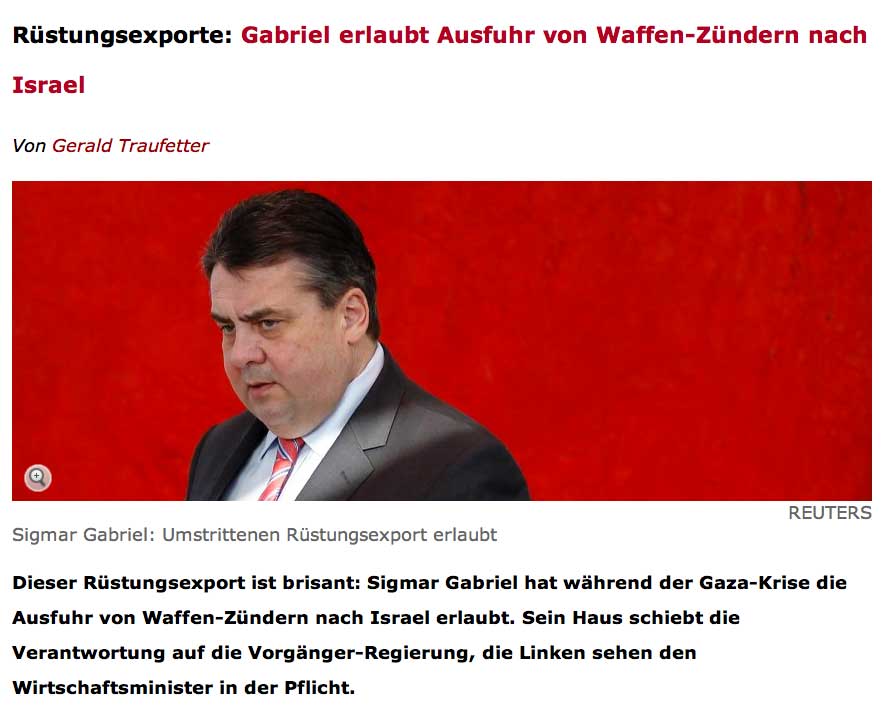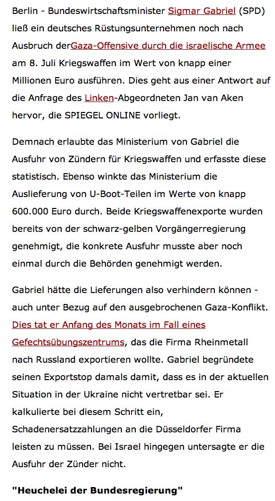 Berlin (dpa) – Deutschland hat auch nach Beginn des Gaza-Krieges noch Rüstungsgüter im Wert von über 600 Millionen Euro an Israel geliefert. Das geht aus einer Antwort von Wirtschafts-Staatssekretär Rainer Sontowski an den Linke-Politiker Jan van Aken hervor. Zwar seien seit Beginn der Angriffe am 8. Juli «keine Genehmigungen nach dem Kriegswaffenkontrollgesetz zum Zweck der Ausfuhrbeförderung nach Israel» erteilt worden. Aber seither habe es bereits zuvor genehmigte Ausfuhren im U-Bootbereich und von Waffenzündern gegeben, teilte das Ressort von Minister Sigmar Gabriel mit.