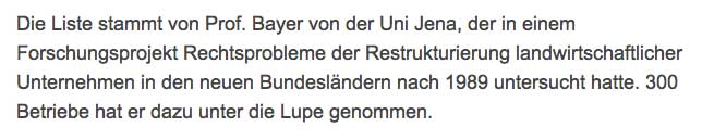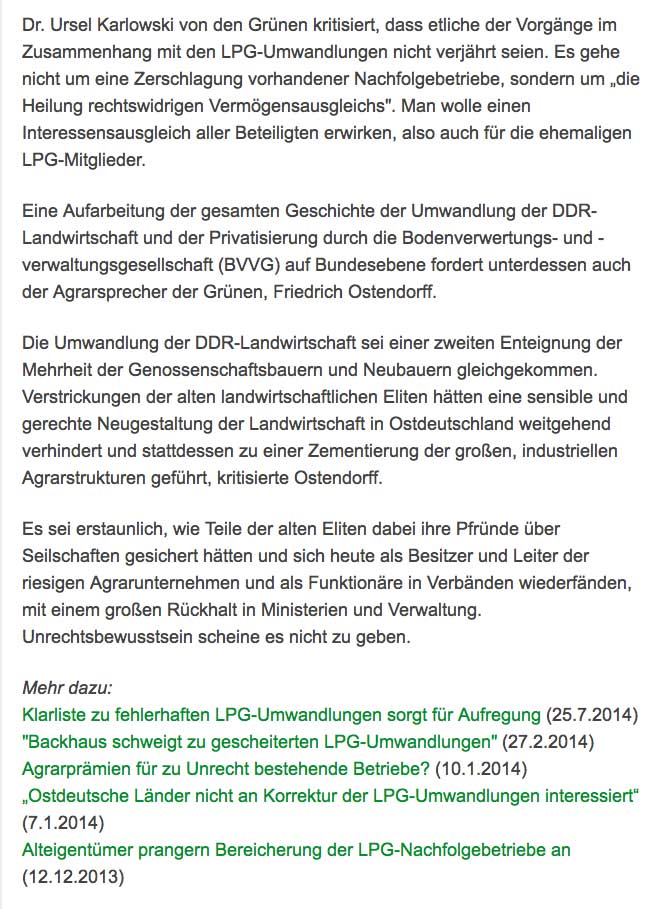 Die von Landwirtschaftminister Backhaus in MV unter Verschluss gehaltene Liste der grössten Unrechtmässigkeiten bei der Umwandlung der LPGs in Nachfolgebetriebe zu Lasten der kleinen Einheiten(Siedler von 1946)ist weder abgeschlossen noch am Ende geheim. Subventionen aus Brüssel müssen im Zweifelsfall an alle Berechtigten von 1946 verteilt werden.