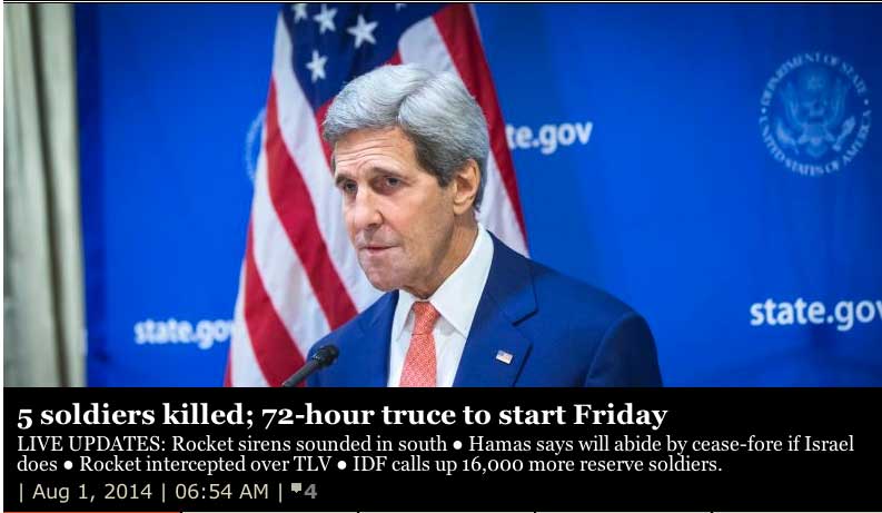 Tel Aviv (dpa) – Kurz vor dem geplanten Beginn einer 72-stündigen Waffenruhe im Gaza-Konflikt haben Israelis und Palästinenser neue Opferzahlen veröffentlicht. Wie die israelische Armee am frühen Morgen mitteilte, starben fünf Soldaten an der Grenze zum Gazastreifen durch eine von radikalen Palästinensern aus dem Küstengebiet abgefeuerte Granate. Israelis und militante Palästinenser haben eine dreitägige Feuerpause vereinbart, die am Morgen um 7.00 Uhr MESZ beginnen soll.