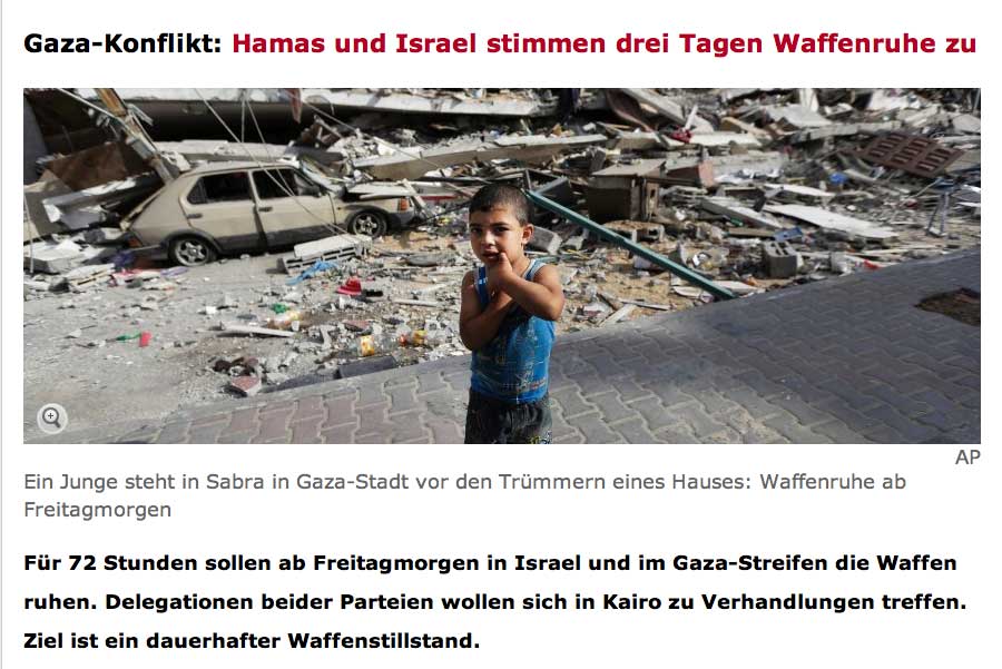 New York (dpa) – Israelis und militante Palästinenser haben eine dreitägige Waffenruhe und sofortige Verhandlungen vereinbart. Die 72-stündige Feuerpause soll am Morgen um 7.00 Uhr MESZ beginnen, wie ein UN-Sprecher in New York sagte. Zudem hätten beide Seiten sofortigen Verhandlungen in Ägypten um eine dauerhafte Waffenruhe zugestimmt. Wie der UN-Sprecher weiter mitteilte, sicherten Israelis und Palästinenser dem UN-Sondervermittler Robert Serry zu, sich an die «bedingungslose humanitäre Waffenruhe» halten zu wollen. Der Zeitraum von drei Tagen könne verlängert werden.
