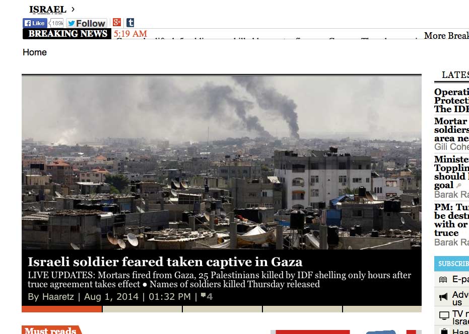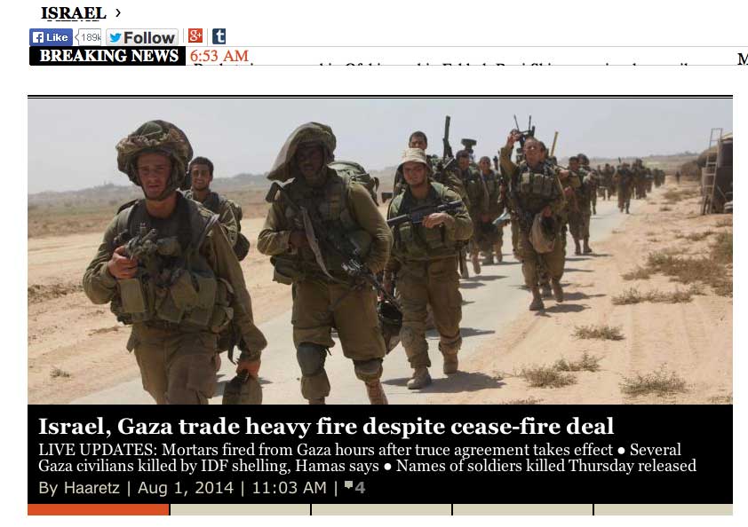 Gaza (dpa) – Die auf drei Tage angesetzte Waffenruhe im Gaza-Konflikt hat nur wenige Stunden gehalten. Israel hat die UN Medienberichten zufolge über das Scheitern der Feuerpause informiert. Israel und die militanten Palästinensern werfen sich gegenseitig vor, sie gebrochen zu haben. Israel befürchtet außerdem, dass einer ihrer Soldaten verschleppt wurde. Im südlichen Gazastreifen waren am Vormittag heftige Kämpfe zwischen israelischen Truppen und militanten Palästinensern aufgeflammt.