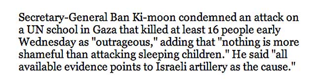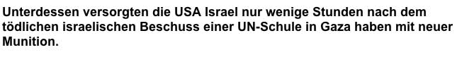 Bei dem Beschuss einer Uno-geführten Schule durch israelische Streitkräfte waren nach palästinensischen Angaben 15 Menschen getötet worden. Das israelische Militär gab an, aus der unmittelbaren Nachbarschaft der Schule beschossen worden zu sein und das Feuer erwidert zu haben.