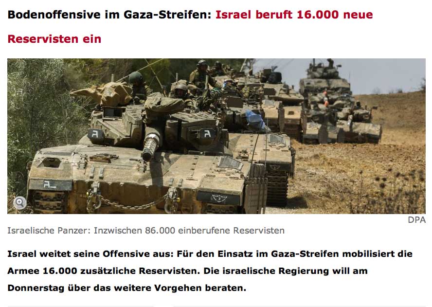 Die israelischen Streitkräfte verkündeten, sie würden weitere 16.000 Reservisten mobilisieren. Damit stieg die Zahl der Reservisten, die seit Beginn der Gaza-Offensive am 8. Juli eingezogen wurden, auf 86.000. Laut einer Armeesprecherin sollen mit den neuen Kräften die bisher eingesetzten Bodentruppen entlastet werden.