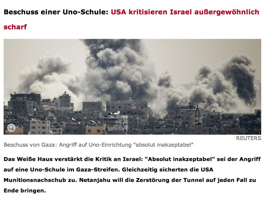 "Wir glauben, dass die israelische Regierung und das israelische Militär mehr tun müssen, um ihren eigenen Standards gerecht zu werden, die sie zum Schutz unschuldiger Zivilisten gesetzt haben", sagte Earnest weiter. Vor einigen Tagen hatte US-Außenminister John Kerryseine Bemühungen um die Vermittlung einer Feuerpause abgebrochen. Dennoch sicherten die USA Israel zu, die Munitionsvorräte aufzustocken. Die USA sind der wichtigste Verbündete Israels.