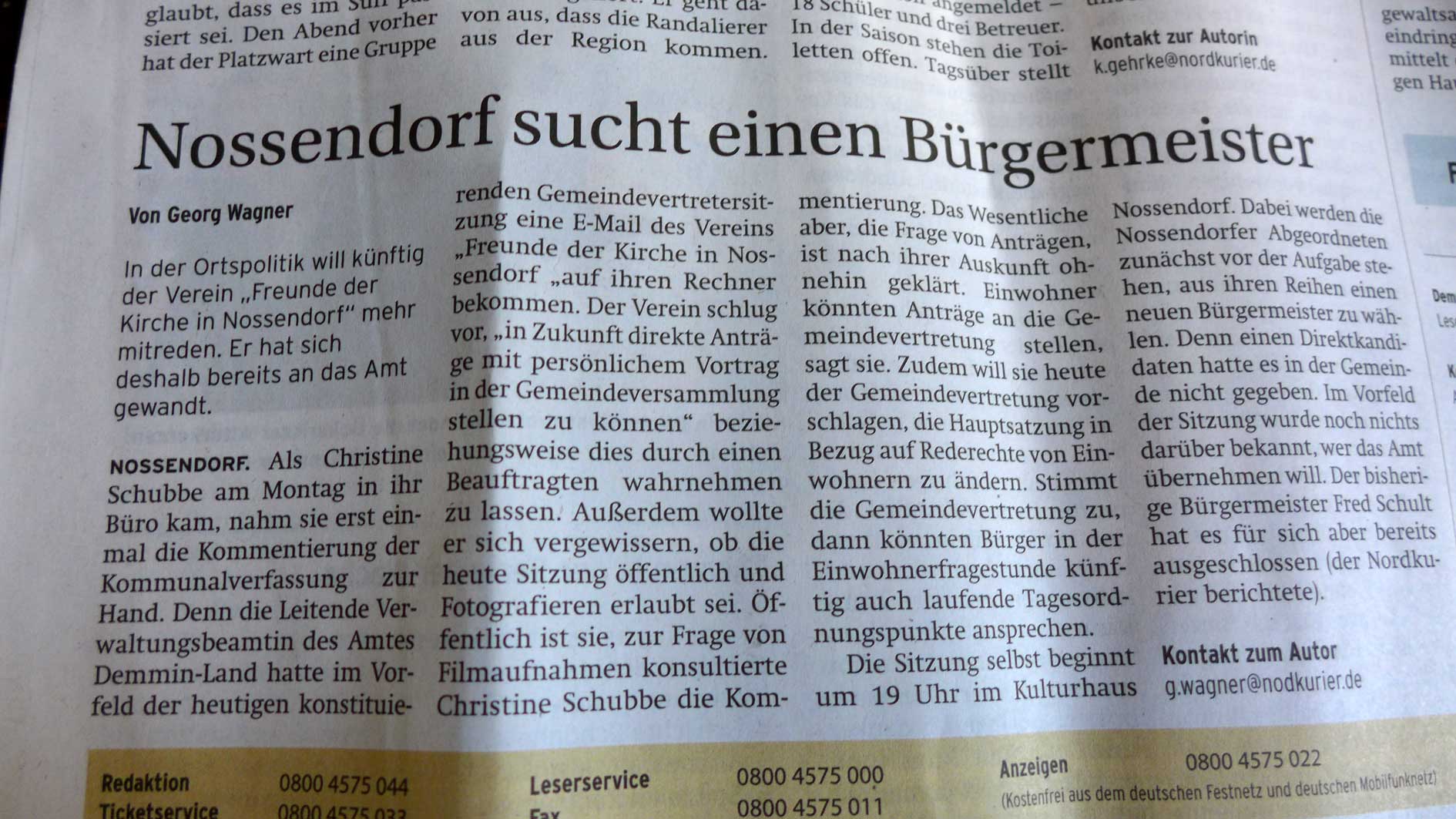 (Erläuterung: Angesichts der Tatsache, dass wesentliche Aktivitäten in letzter Zeit von unserem Verein ausgingen (Turm-Wiedererrichtung, Vorschläge für die Kulturlandschaft im ländlichen Raum Nossendorf, niedergelgt für das Leader-Programm (darin Badeplatz in Nossendorf und Wege-Rekonstruktion an der Trebel), Rettung des Transformationhäuschens und Pläne für die Kita (Treffen Sellering und Entwürfe nach hist. Bildern der Fam. Hamann) und nun nächste Pläne für Nossendorf vorbereitet sind (mit Investitionsgedanken und Expertengutachten), schlagen wir im Sinne einer besseren Zusammenarbeit dieses Verfahren vor.)