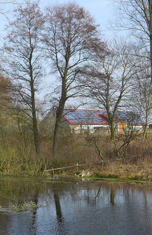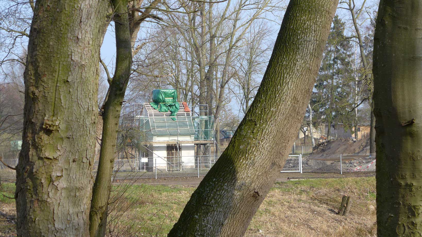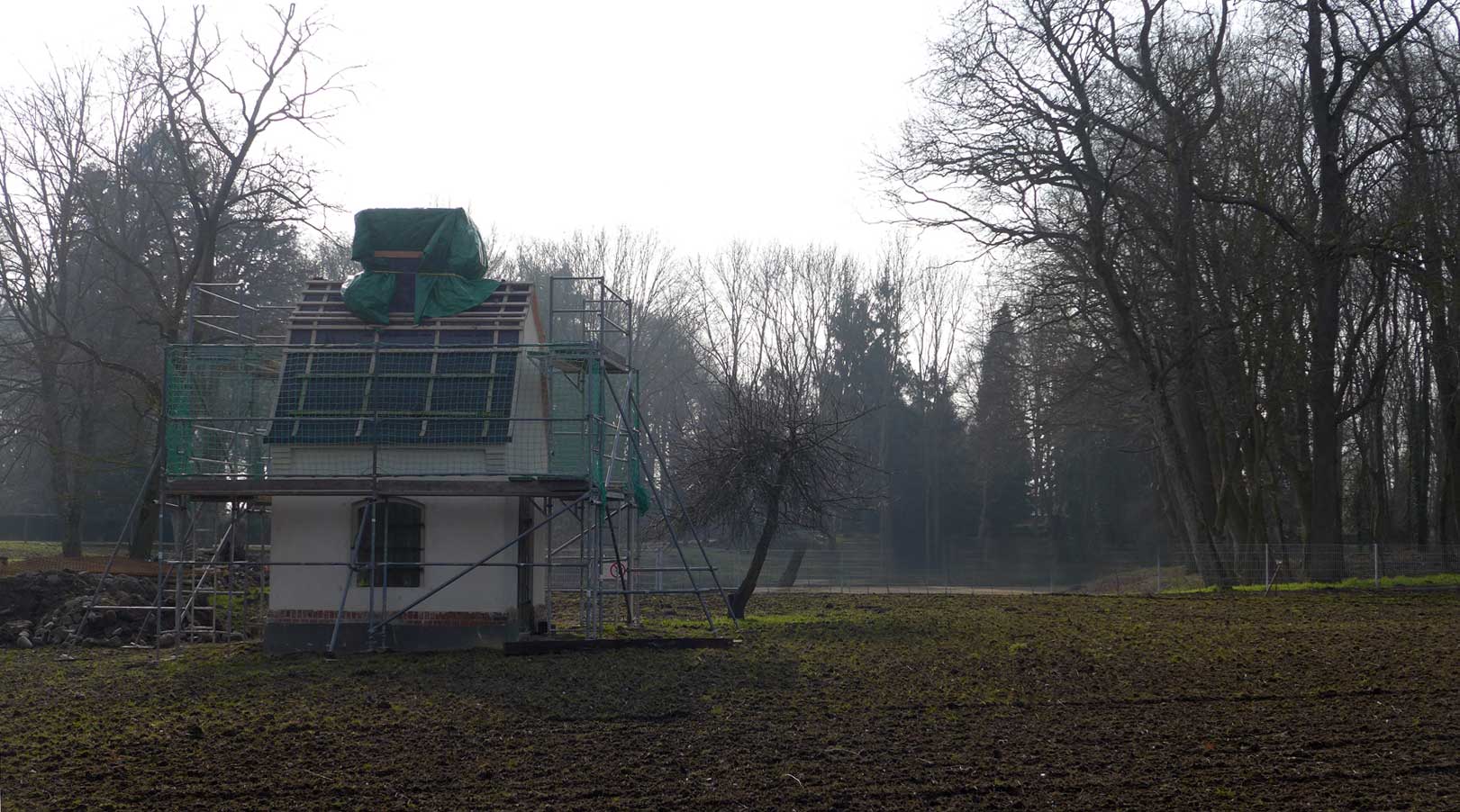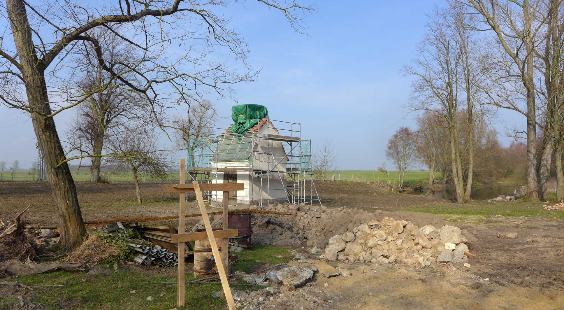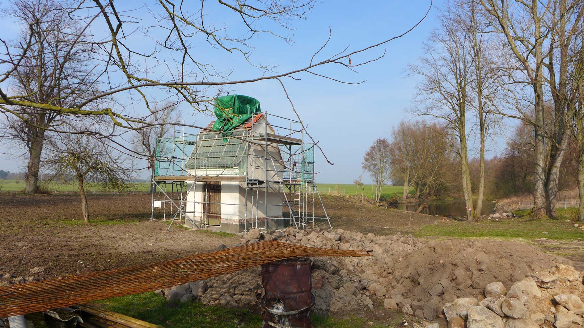 gekauft auch, den Grund, hier rundum frei, 500 Euro. Die Abrissruine in eigene Hand genommen, demnächst mit neuem Dach