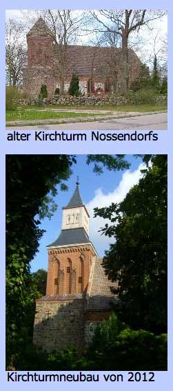 Unten die Internetseite Gemeinde Nossendorf mit dem Bild der DDR Version als "alte Kirche".
