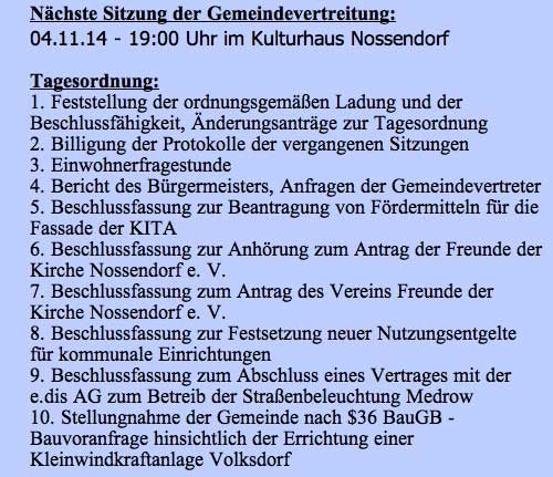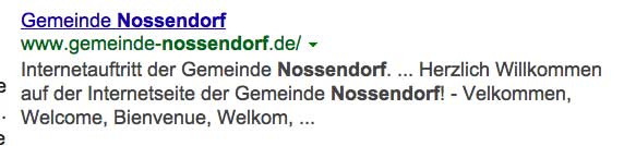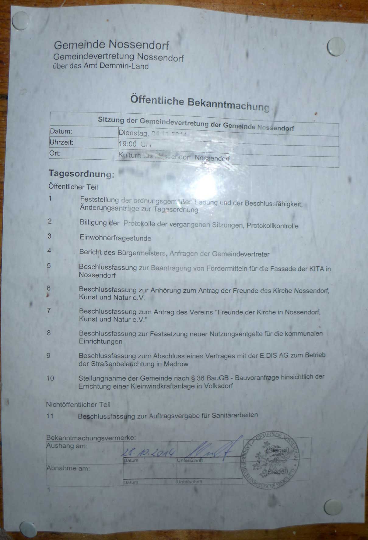 Die Internetseite Gemeinde Nossendorf.de mit Grusswort des Bürgermeisters und Forum der amtlichen Bekanntmachungen zu Wahlen und Sitzungen ist angekündigt als offizieller Internetauftritt der Gemeinde, und so bei Google an erste Stelle des Stichworts Nossendorf für alle Besucher in der Erwartung redlicher Informationen jenseits irgendwelcher Privatentscheidungen durch Meinungen oder Auswahl privater Vorlieben, obwohl sie sich intern auf Nachfrage selber als privat erklärt. Das ist eine Täuschung des Users, der falsche und fehlerhafte Bekanntmachungen(siehe unten)als amtlich korrekt vermuten muss. Es fragt sich wer den Auftrag erteilte und wer die Namensgebung prüft und wer den Link von der offizielle Sammel- Seite aller Dörfer des Kreise Demmin Land veranlasst oder überwacht. Wenn solche täuschenden Titel zu Ortsnamen Nossendorf.de mit amtlichen Daten und links keine Auflagen an den Inhalt bedeuten dann sollte auch Nossendorf. eu in Zukunft vom Kreis mit Link und amtlichen Mitteilungen oder Grussworten versorgt werden.