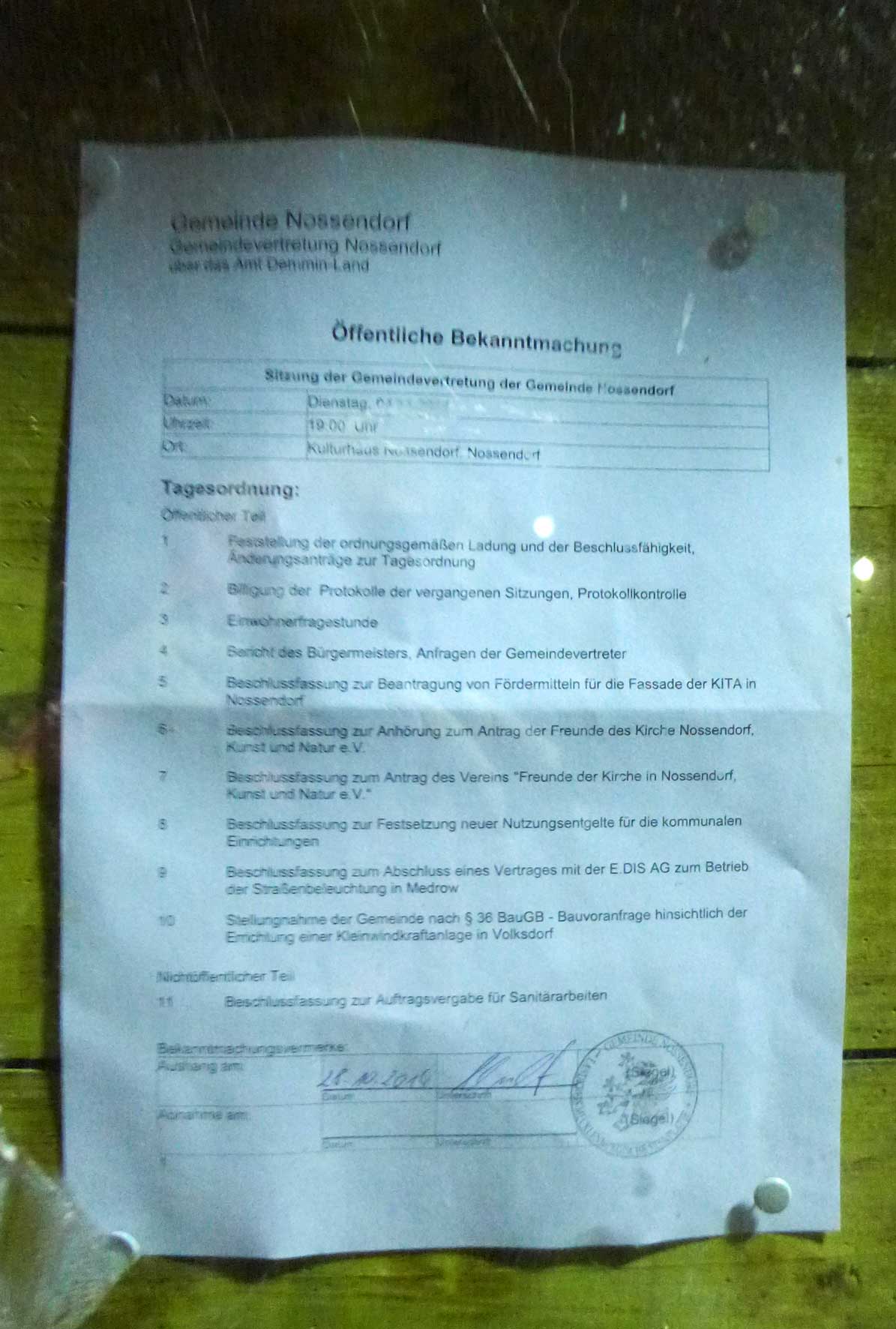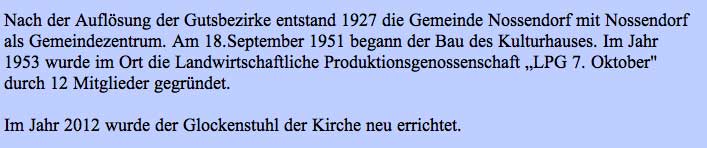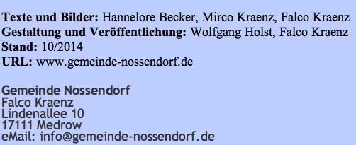 Von dem allen weiss die "homepage" der Gemeinde Nossendorf. de des Internets nichts. Und sie sagt Falsches dazu. Mit hinweisendem Link von der offiziellen Internetseite der Dörfer rundum, im Kreis Mecklenburgische Seenplatte, des Landes Mecklenburg Vorpommern. Das alles ist eher für Informationen suchende Touristen als Seite der Gemeinde Nossendorf.de ein fake und Ettikettenschwindel privater Interessen -freundlich auszudrücken- mit Amtsträgern im Bunde.