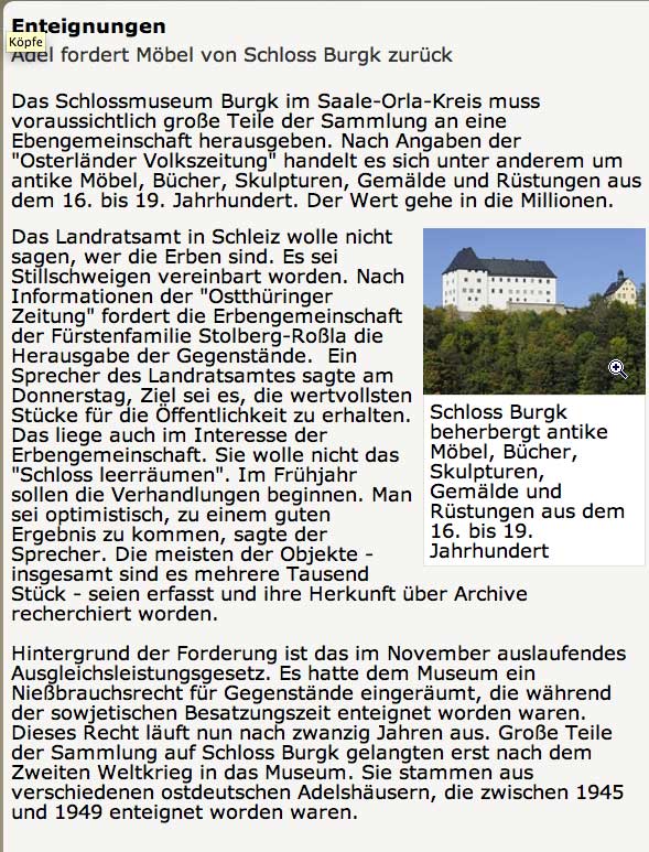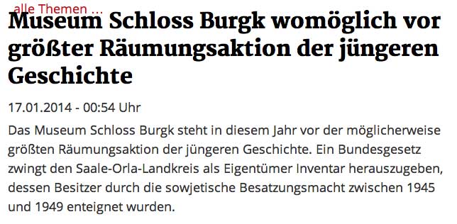 Eine leider gar nicht so abwegige Vermutung. Denn das Ausgleichsleistungsgesetz von 1994 spricht den Erben der enteigneten Burg- und Schlossherrn zwar keinen Grundbesitz, aber die beweglichen Teile des alten Familienbesitzes zu. Ein konkretes Beispiel läuft gerade im thüringischen Schloss Burgk ab. Und es dürfte Schule machen.