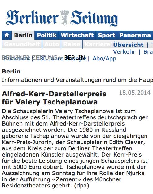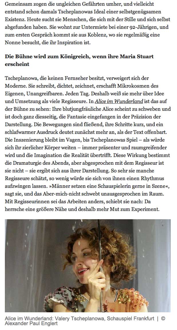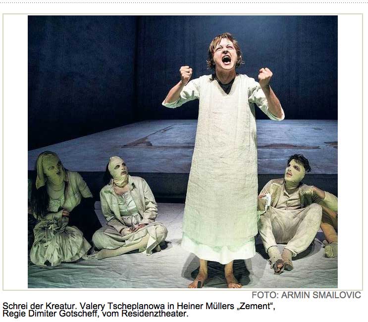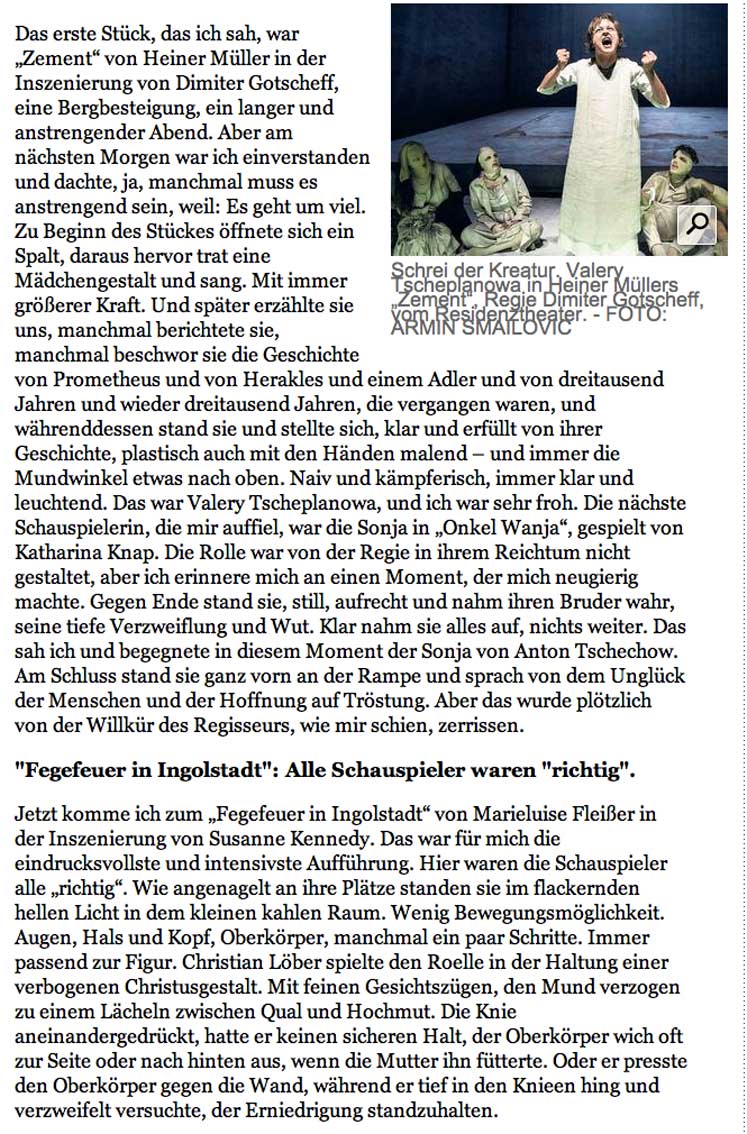 Aber unbeirrt von der Not und beschriebenen Schlachtfeldern des heutigen Theaters, dessen auch, dass sie immer als Betrieb markierte, selbst nun Opfer perfider Fälschungen oder sträflicher Unkenntniss ihrer Vita durch die Einladenden selbst, zieht sie ihre Spur.>>