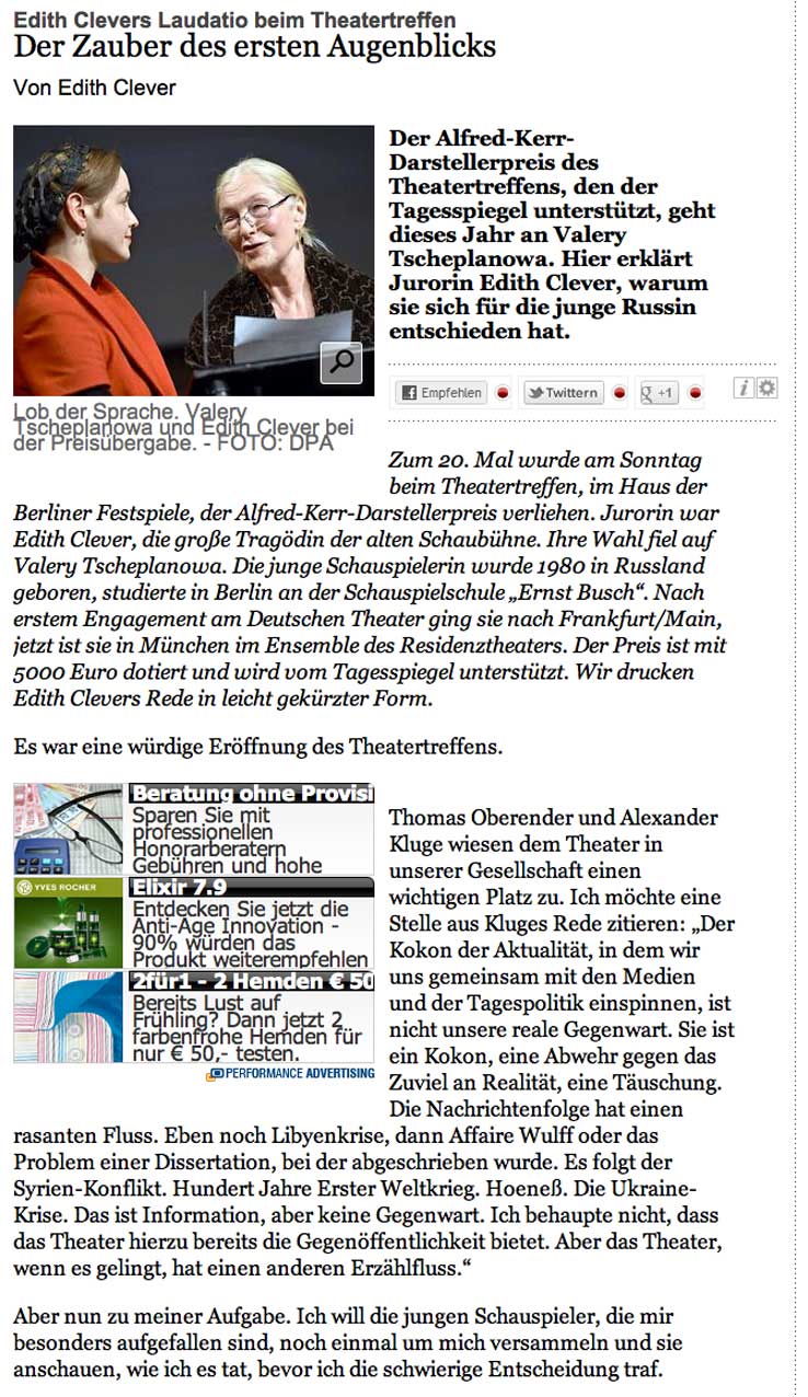 Ich möchte eine Stelle aus Kluges Rede zitieren: „Der Kokon der Aktualität, in dem wir uns gemeinsam mit den Medien und der Tagespolitik einspinnen, ist nicht unsere reale Gegenwart. Sie ist ein Kokon, eine Abwehr gegen das Zuviel an Realität, eine Täuschung. Die Nachrichtenfolge hat einen rasanten Fluss. Eben noch Libyenkrise, dann Affaire Wulff oder das Problem einer Dissertation, bei der abgeschrieben wurde. Es folgt der Syrien-Konflikt. Hundert Jahre Erster Weltkrieg. Hoeneß. Die Ukraine-Krise. Das ist Information, aber keine Gegenwart. Ich behaupte nicht, dass das Theater hierzu bereits die Gegenöffentlichkeit bietet. Aber das Theater, wenn es gelingt, hat einen anderen Erzählfluss.“