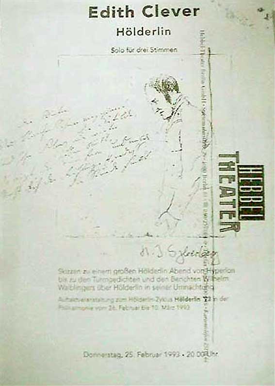 Es war der Gedächtnistag des Hölderlin und Nele Hertling vom Hebbeltheater hatte gefragt irgendwas zum machen, seiner zugedenken. mehr als drei Tage Proben war nicht drin, und 2-3 Auffuhrungen. Am liebsten Hölderlin und Edith Clever ohne den anderen, wie sollte das gehen, sie danach nie wieder in 3 Tagen. So aber auch auf Reisen nach aussen. Nach dem Traum der einzig mögliche Ausklang im Raum nun in zwei Versionen. Das Unsere ankündigend.
