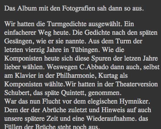 Er kam ins Hebbeltheater und wollte, was er sah, teils gelesen( die Berichte von Watblinger über Hölderloin im Turm )und viel im Raum memorierend(aus Hyperion und die Turmgedichte) und dachte sich das im Orchesterraum der Philharmonie, wo er eine Reihe von Musik mit Texten überlegte. Diesmal ohne Orchester, nur mit sich selbst am Klavier. Dazu musste er den Schubert wegdenken, den wir dazumontierten. den von ihm favorisierten Kurtag vorschlagen.
