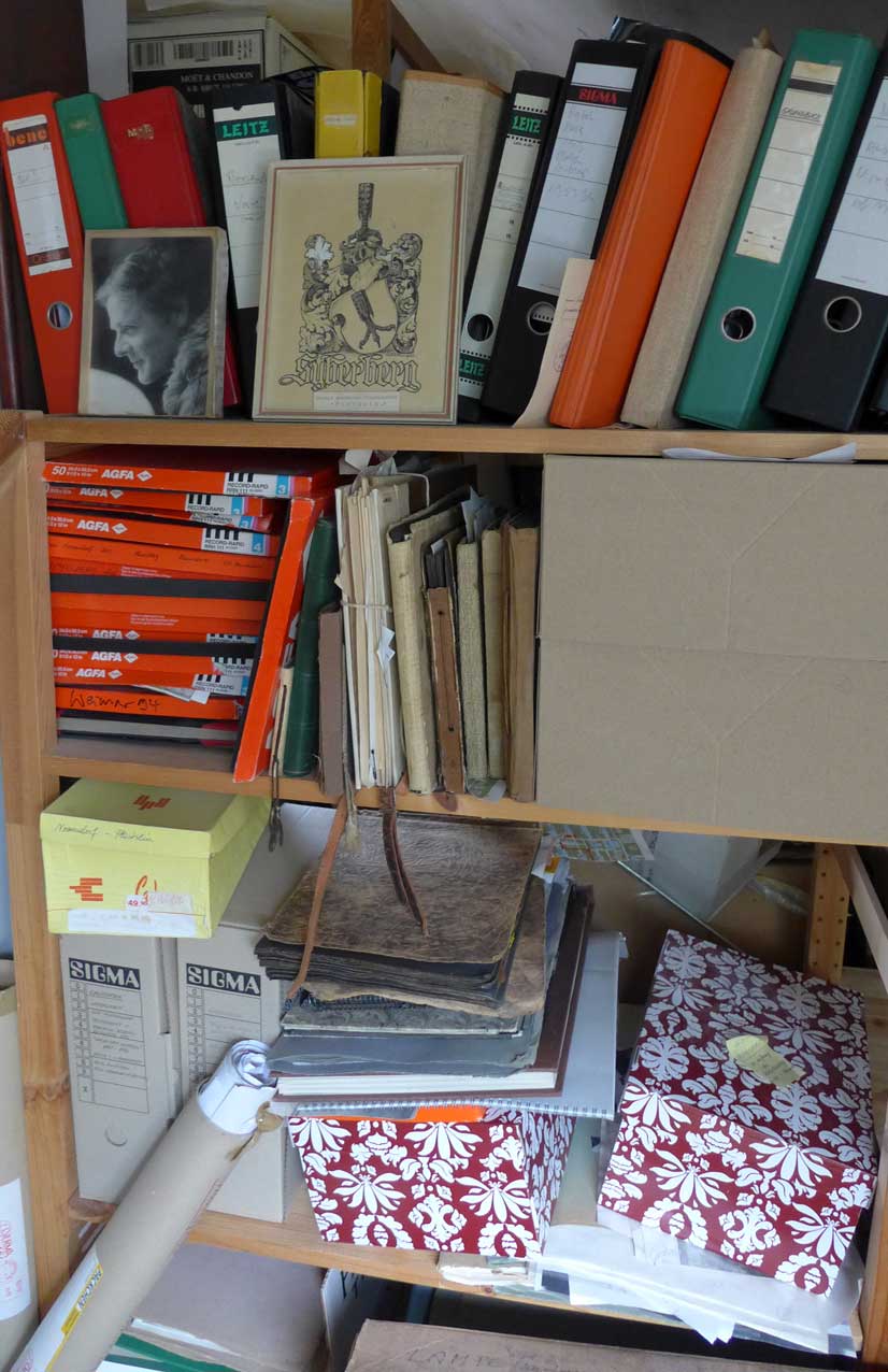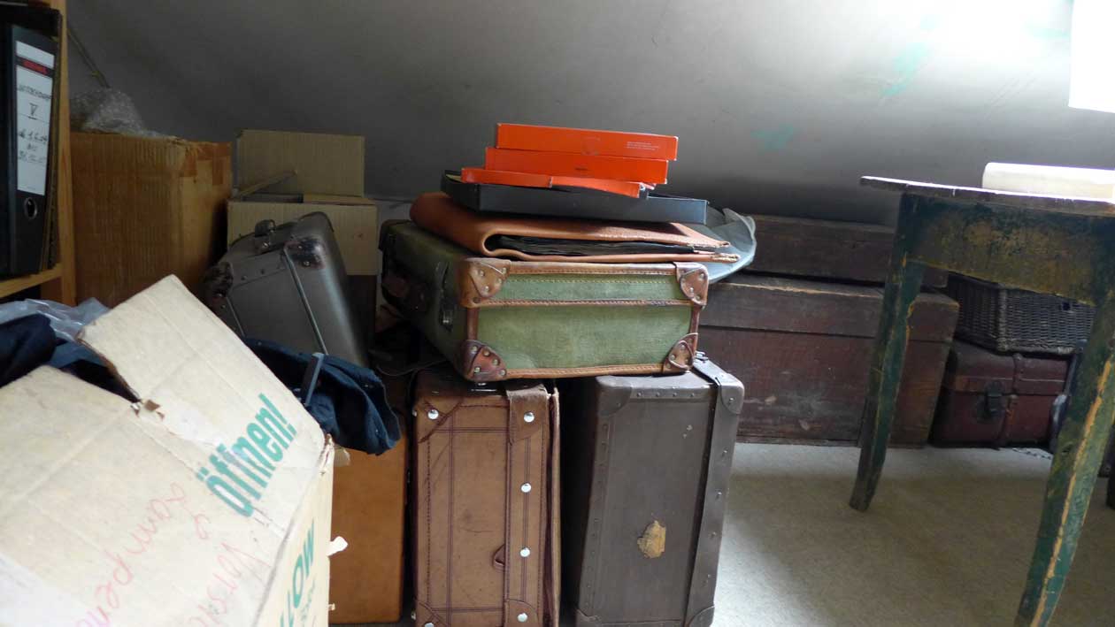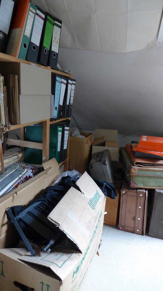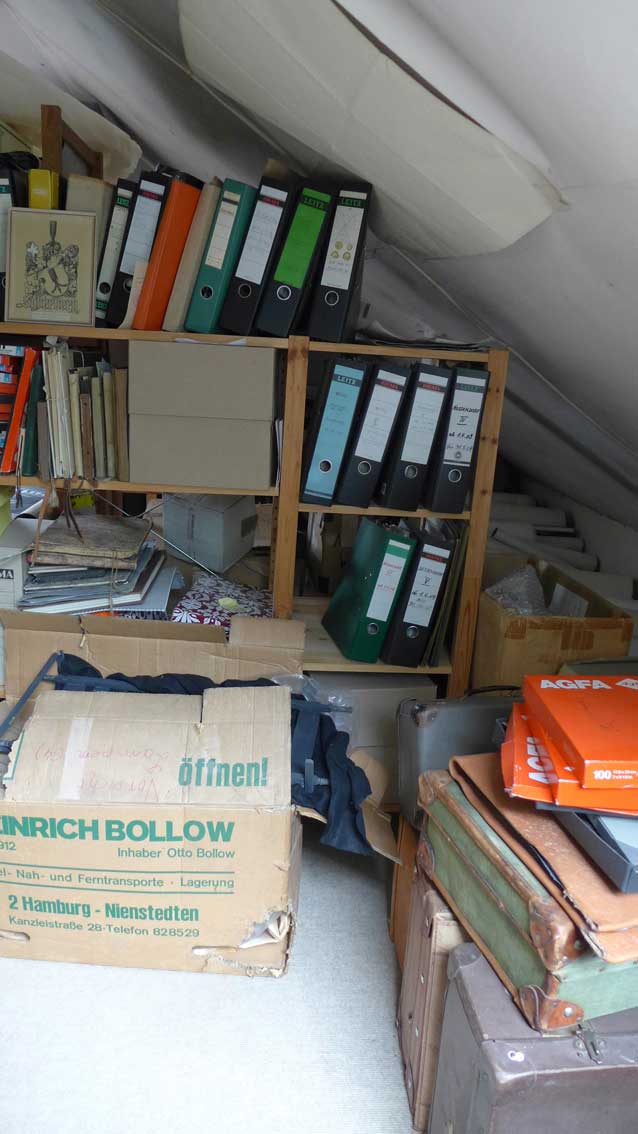 Unter diesem Bild in der äusserste Ecke des Hauses, wo des Vaters Erbe mit Alben und letztem Gepäck vor dem Tode verwahrt wurden, finden wir auch die Dokumente der Not und deren Gestaltung. Wenn von hier verlagert, sollte man es in den Behältnissen und deren Anordung und gewachsenen Beschriftungen als eigene Einheit tun.