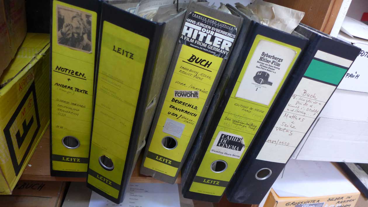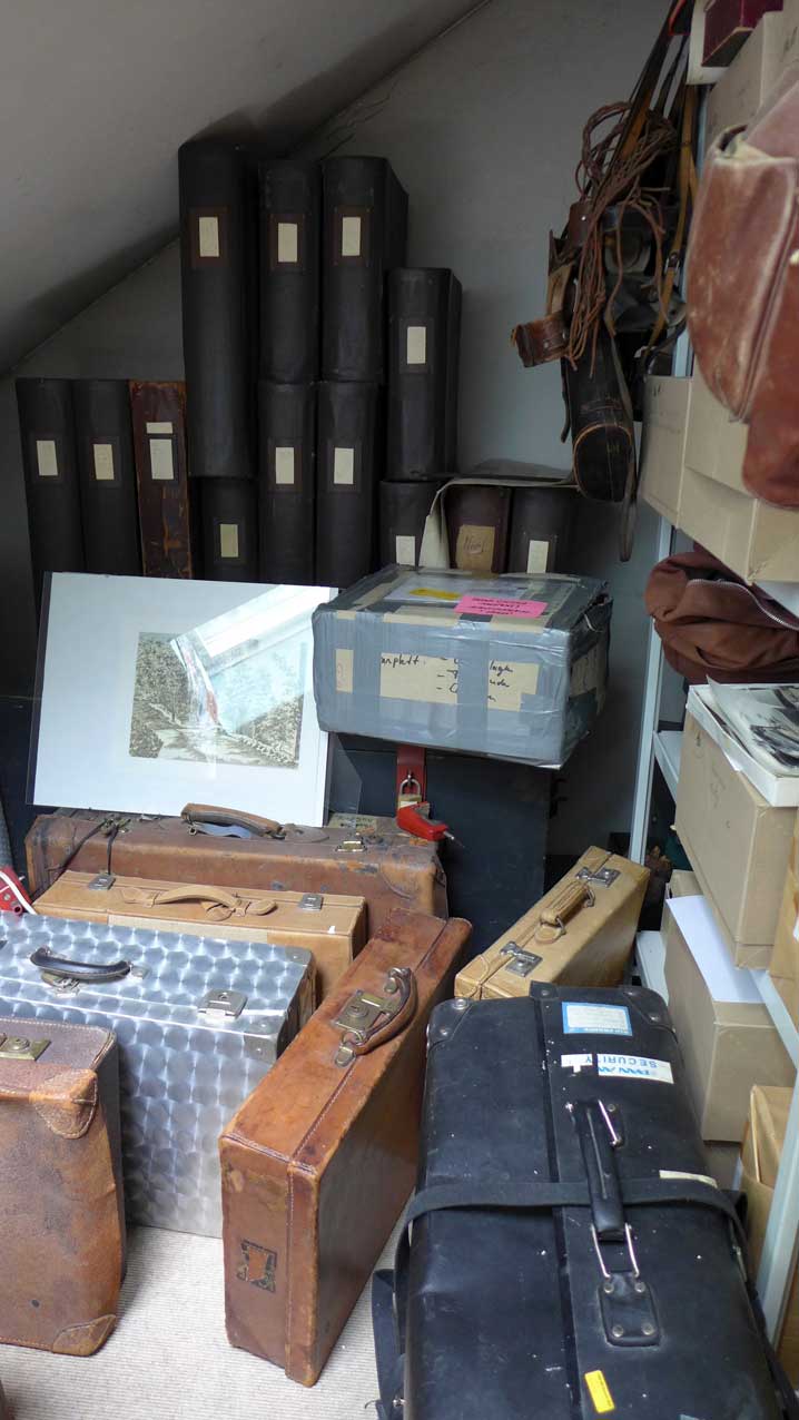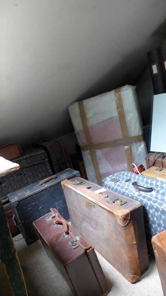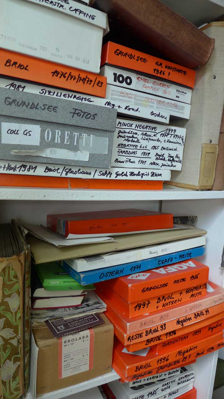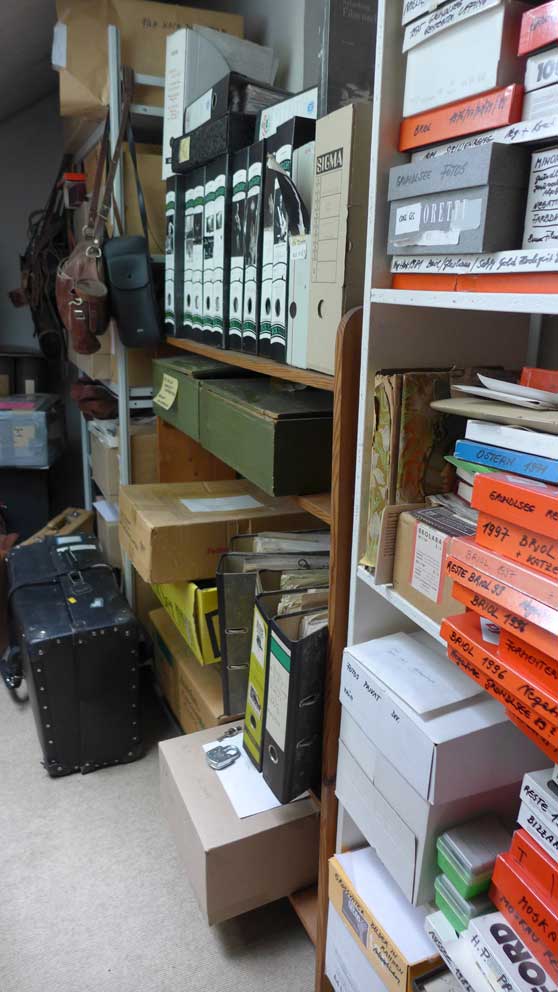 Unter diesem Bild in der äusserste Ecke des Hauses, wo des Vaters Erbe mit Alben und letztem Gepäck vor dem Tode verwahrt wurden, finden wir auch die Dokumente der Not und deren Gestaltung. Wenn von hier verlagert, sollte man es in den Behältnissen und deren Anordung und gewachsenen Beschriftungen als eigene Einheit tun.