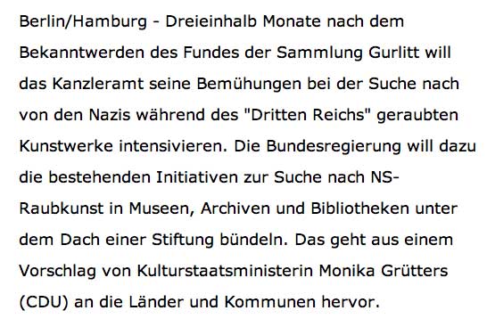 Fall Gurlitt zeigt das Desaster. Und wo das hinführrt. Viel Entfremdung der Menschen und Hetze. Andienen und krumme Menschen. Am End alles Verloren Recht und Staat und Freundschaften.