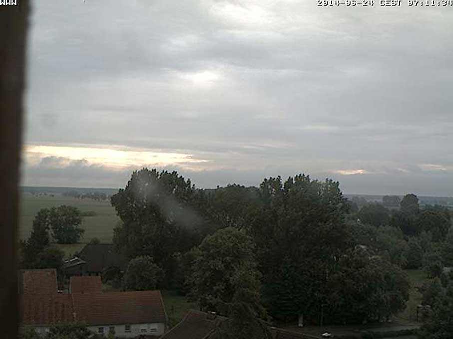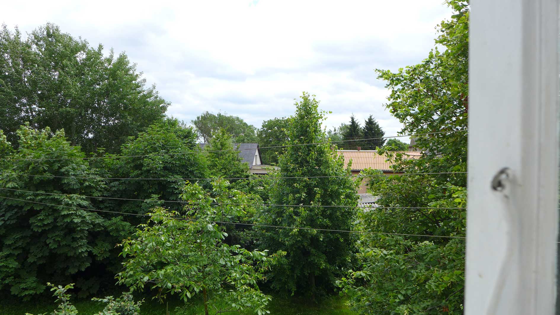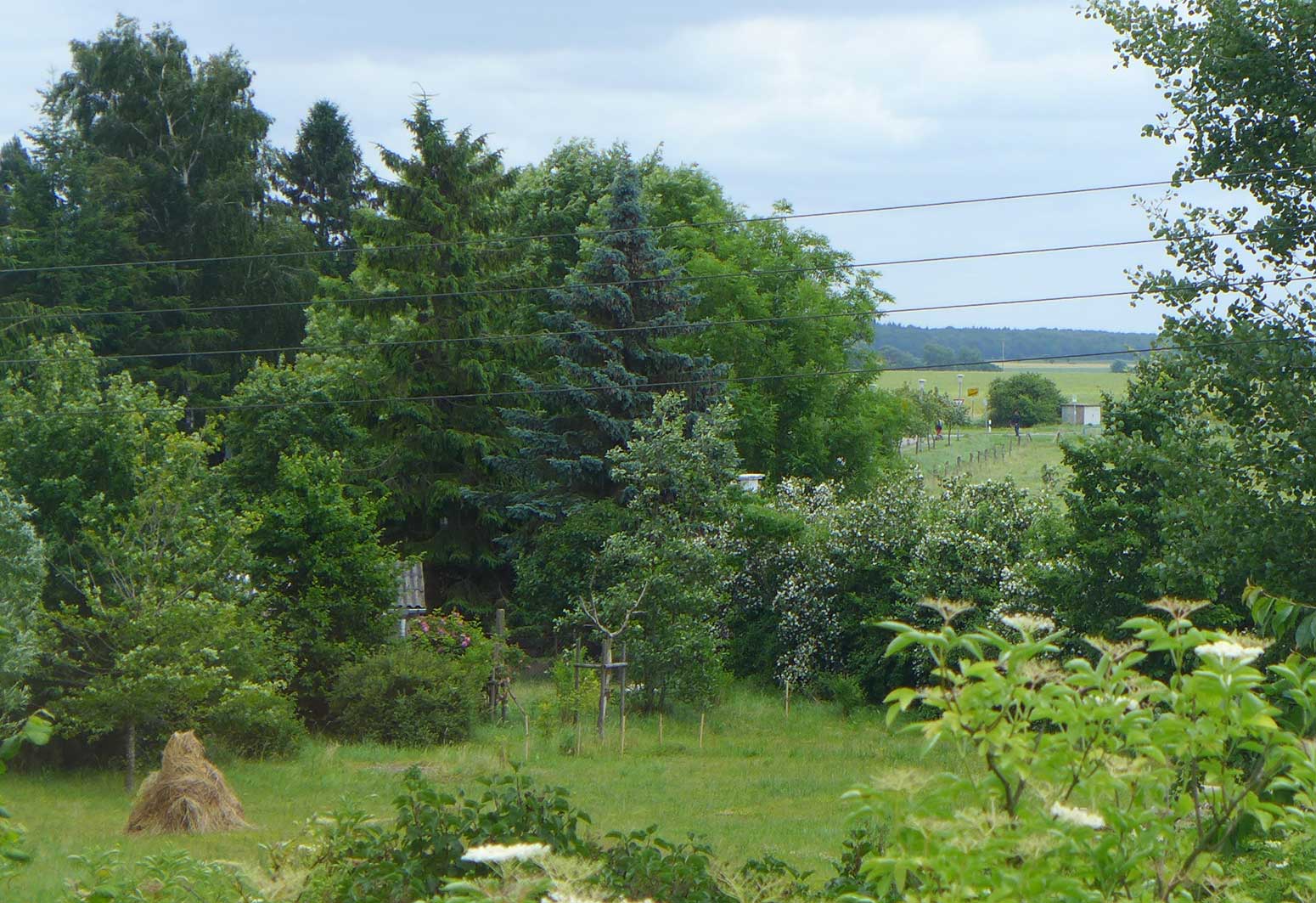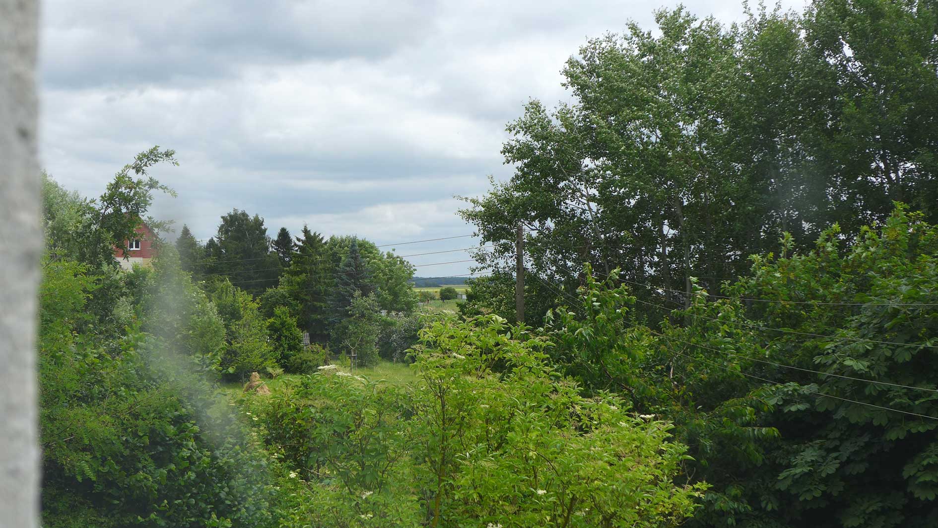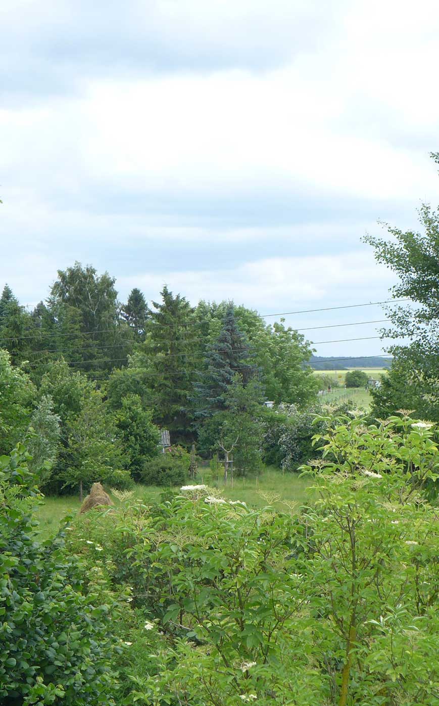 der Blick aus dem Kinderzimmer heute durch die Zeiten. Nun über die Felder an der Einfahrt des Dorfes vorbei bis zum Woldeforst. Kenner wissen, was das alles bedeutet.