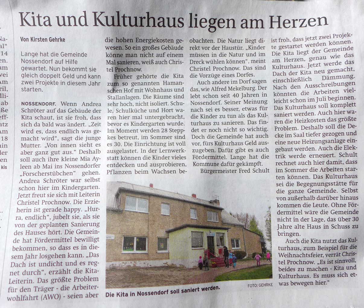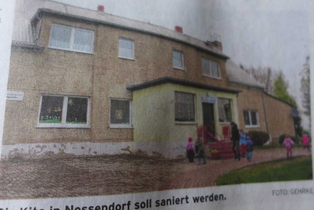 Die Kita(Kindertagesstätte) in Nossendorf, so lesen wir, soll partiell auf neuen Stand gebracht werden. Und zwar das Dach und der Sockel. Dafür seien öffentliche Gelder bewilligt. Und zwar schnell, noch im Sommer anzufangen.