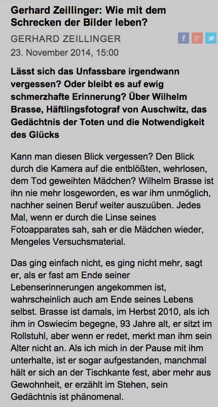 Ich schrieb einen Brief in die ulica Sienkiewicza, auch weil ich wusste, wie gern Brasse sich auf Deutsch unterhielt. Ich schrieb ihm, dass ich sein Buch gekauft hatte, und von der Widmung darin, der Widmung mit dem Glück. Aber ich bekam keine Antwort mehr. Wenige Wochen später hörte ich die Nachricht von seinem Tod, und ich frage mich, ob die Bilder von den nackten jüdischen Mädchen nun ausgelöscht sind oder ob ihr Schrecken in einem größeren Gedächtnis genauso gebannt bleiben wird. (DER STANDARD, 22.11.2014)