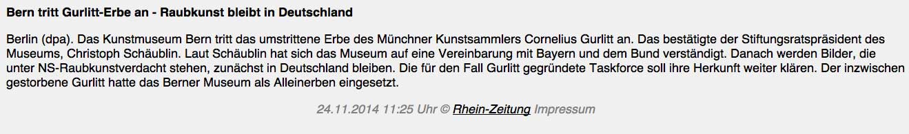Was die das traurige Gerangel der Medien, Juristen und Politiker um die Bilder betrifft, als Zeugen und Akteure des Marktes, wird es auf das Konto jüdische Selbstbeschädigung und Förderung eines tragischen Antisemitismus gehen. Die Bilder selbst hätten als Zeugnis der Geschichte verstanden und als Einheit zusammenbleiben und ausgestellt werden müssen. Am Besten dort, wo sie damals nicht hindurften: im Haus der Kunst in München oder im Zentrum Berlins: im wiederenststehenden Schloss. Mehr Geschichte geht nicht. Mit Anteil und Geschichte aller als Rettungsaktion. Der Kunst durch die Kunst. Ein Installation. Die deutsche Selbstbeschädigung ist sträflich.
