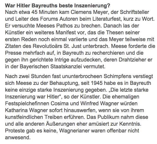 Bei der Veranstaltung im Kesselhalle an der Katharina-von-Bora-Stra§e beschimpfte Meese rund 45 Minuten lang die Festspielleitung. Katharina Wagner und ihren kaufmännischen Direktor Hans Dieter Sense bezeichnete er als ãPissnelken und Kackärsche. Den neuen Regisseur nannte er einen Speichellecker und "Lakaien".Richard Wagner würde sich angesichts der von Bayreuth ausgehenden Kunsthasskampagne gegen Meese im Grabe umdrehenÒ.