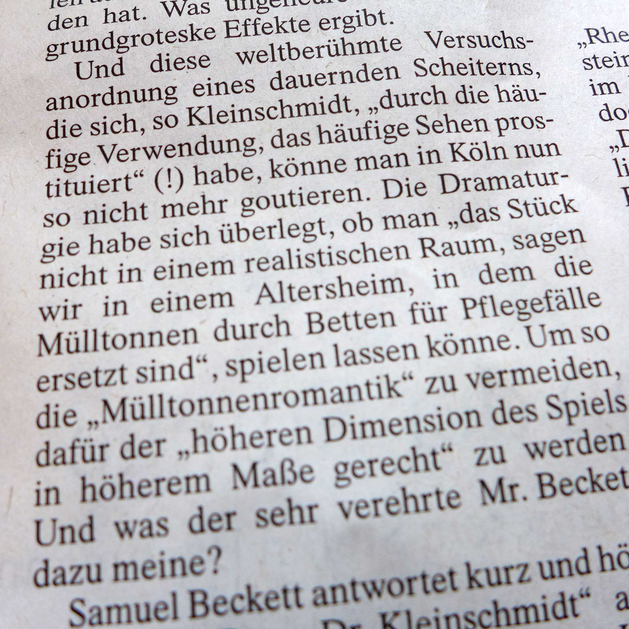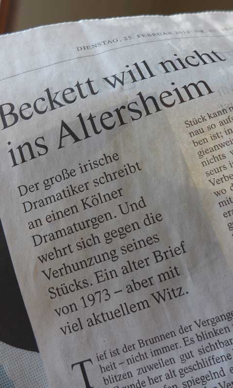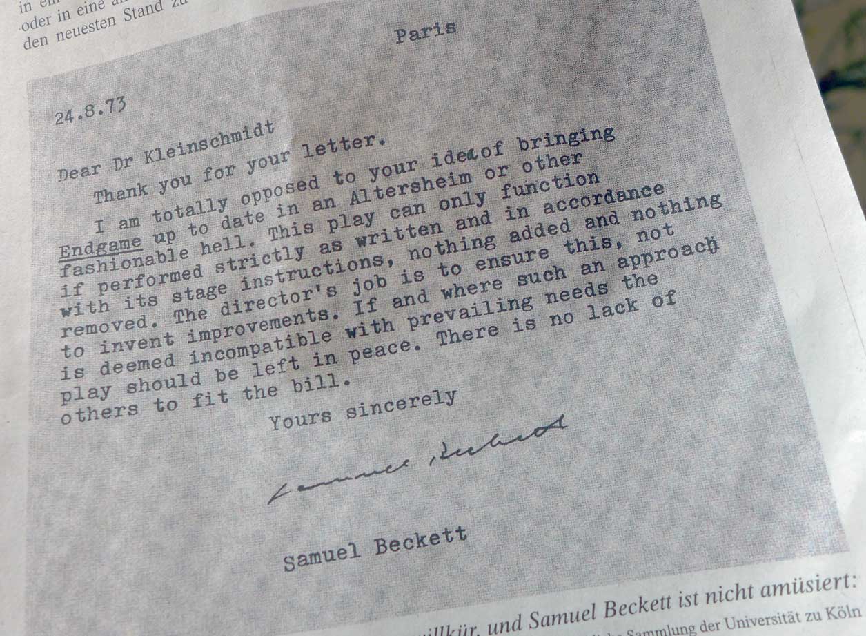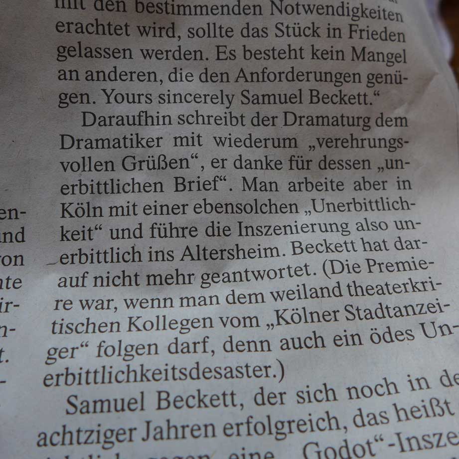 Eigentlich ist es Betrug, wenn sie Beckett draufschreiben, mit seinen genauen Angaben zu Bühne und liefern etwas anderes, denn hier zuzmindest gibt es neben den Texten genaue Anweisungen wie das und wo sein soll. Einklagbar. Oder man geht davon aus wenn man ins Theater geht, ist verabredungsgemäss alles nicht wahr. Wer will da noch mit machen oder alles Klamauk und alle selbst schuld. Eben Theater -auf der niedrigsten Ebene seiner Erscheinung, Hochsubventioniert, um des Betrugs willen. Kollabortion mir dem Zeitgeist. Abbildfunktioin. Na also alles nur Theater und man fühlt sich dabei. Gewesen zu sein.