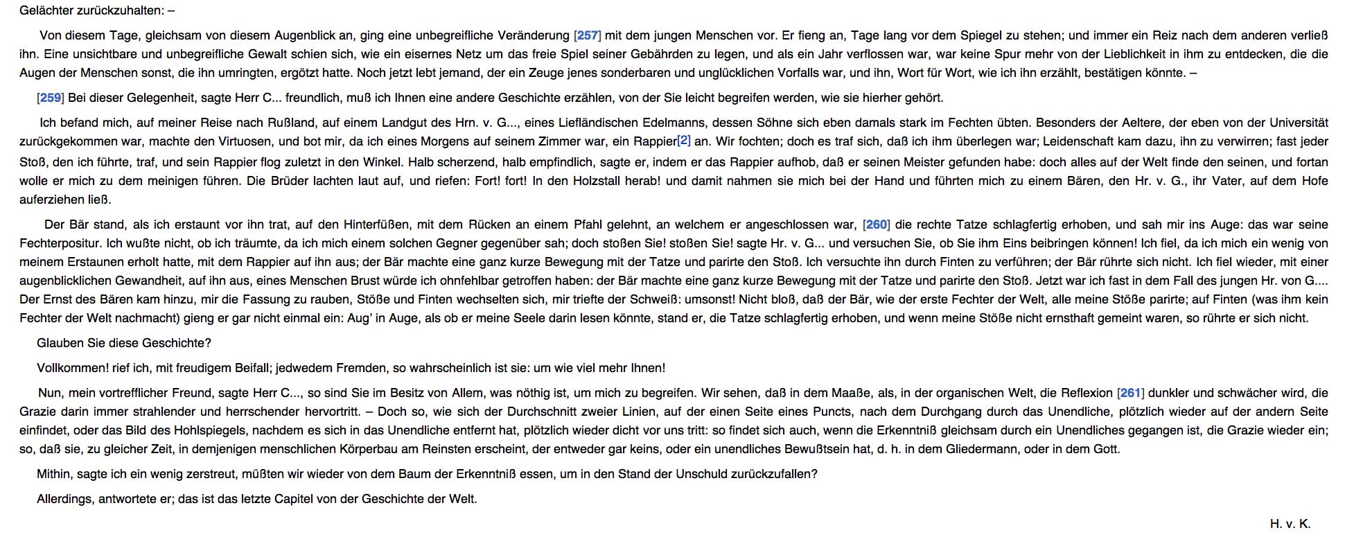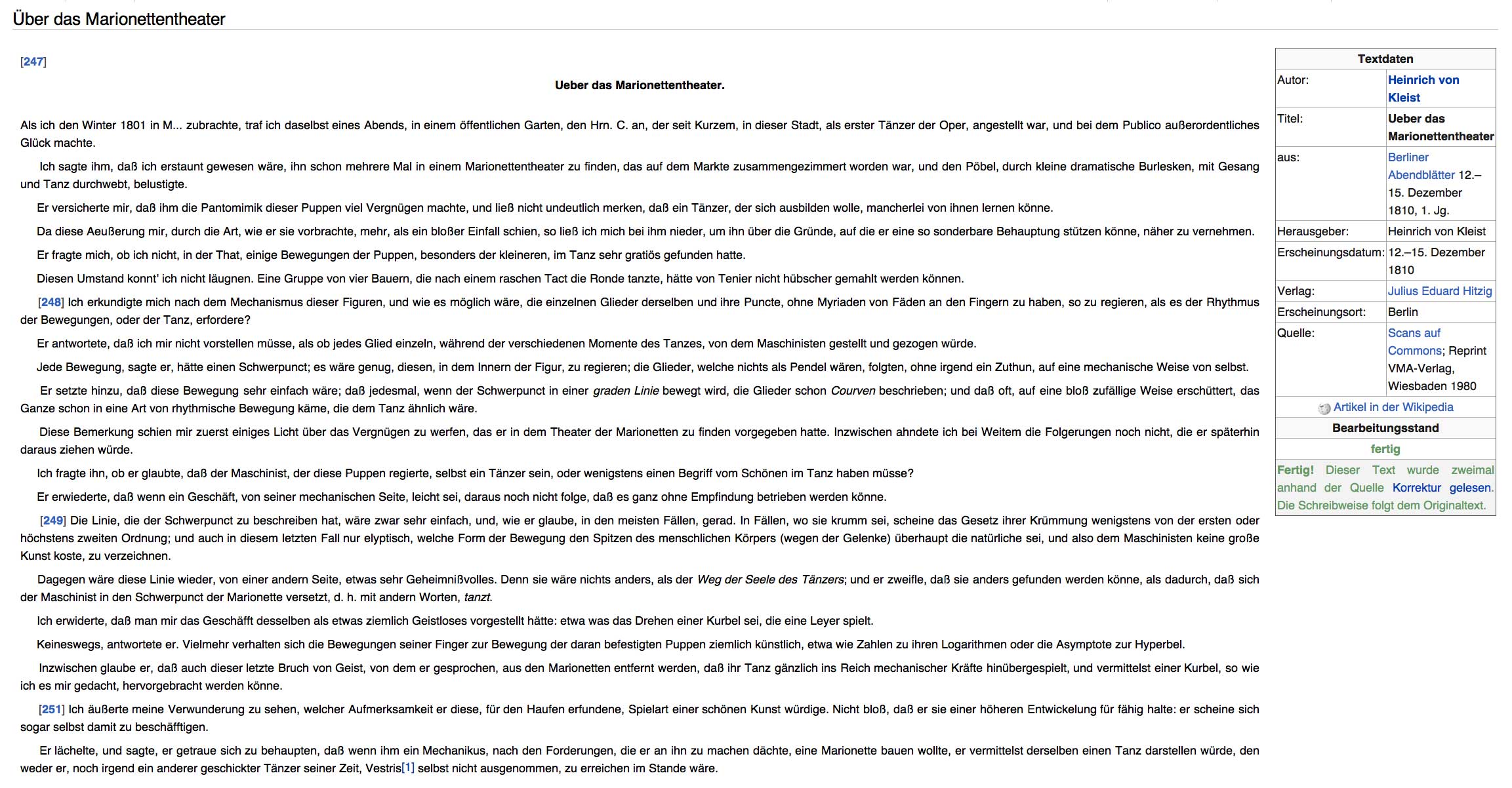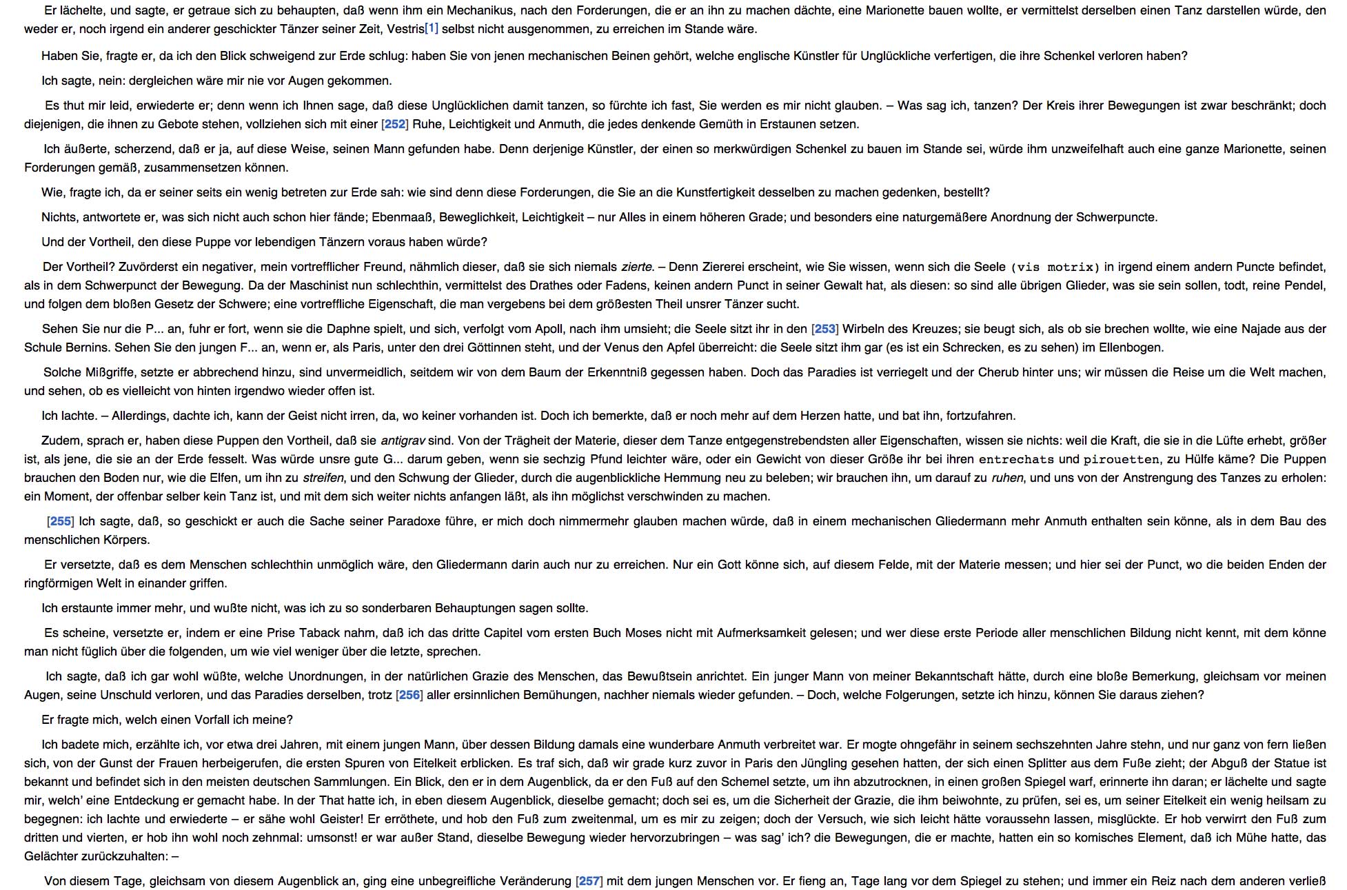 Zu den Gedanken über Puppen und Marionetten in der Darstellung dramatischer Vorgänge haben wir den schönen Text von Kleist, hier in seiner ursprünglichen Fassung von ihm in seinen Abendblättern gedruckt