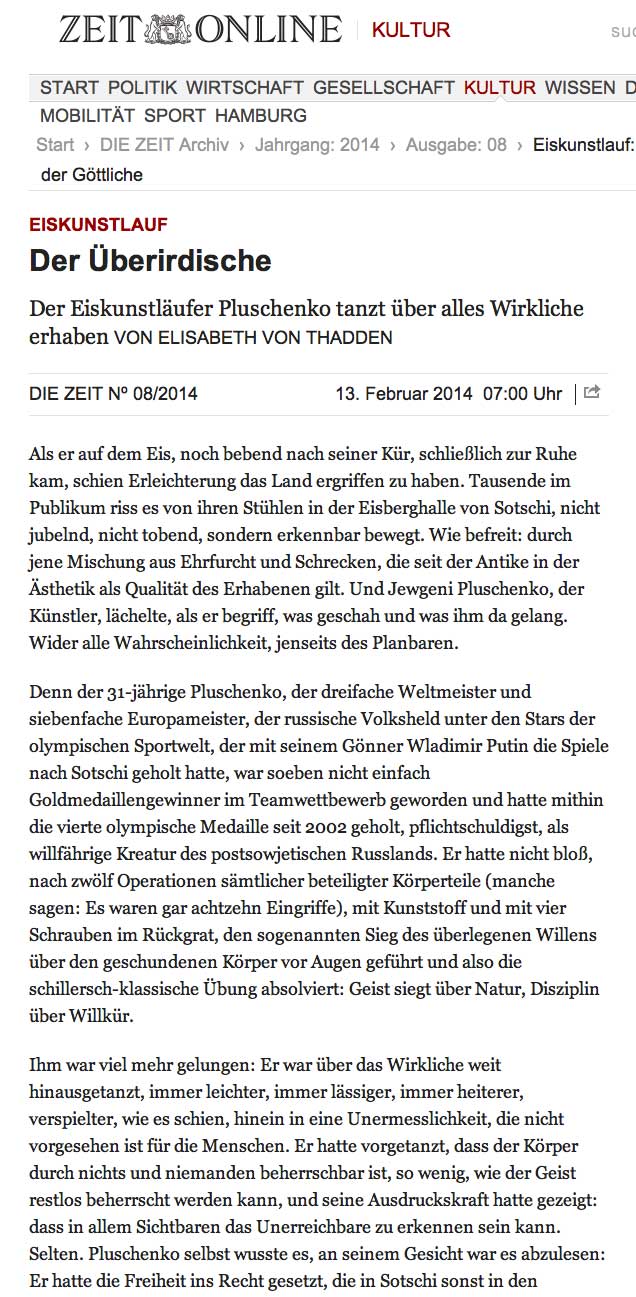 Ihm war viel mehr gelungen: Er war über das Wirkliche weit hinausgetanzt, immer leichter, immer lässiger, immer heiterer, verspielter, wie es schien, hinein in eine Unermesslichkeit, die nicht vorgesehen ist für die Menschen. Er hatte vorgetanzt, dass der Körper durch nichts und niemanden beherrschbar ist, so wenig, wie der Geist restlos beherrscht werden kann, und seine Ausdruckskraft hatte gezeigt: dass in allem Sichtbaren das Unerreichbare zu erkennen sein kann. Selten. Pluschenko selbst wusste es, an seinem Gesicht war es abzulesen: Er hatte die Freiheit ins Recht gesetzt, die in Sotschi sonst in den hintersten Rängen sitzt, lückenlos überwacht. An dieser Kür auf dem Eis hat alle Instrumentalisierung des Menschen für das politische Großprojekt Putin ihre Grenze erfahren.