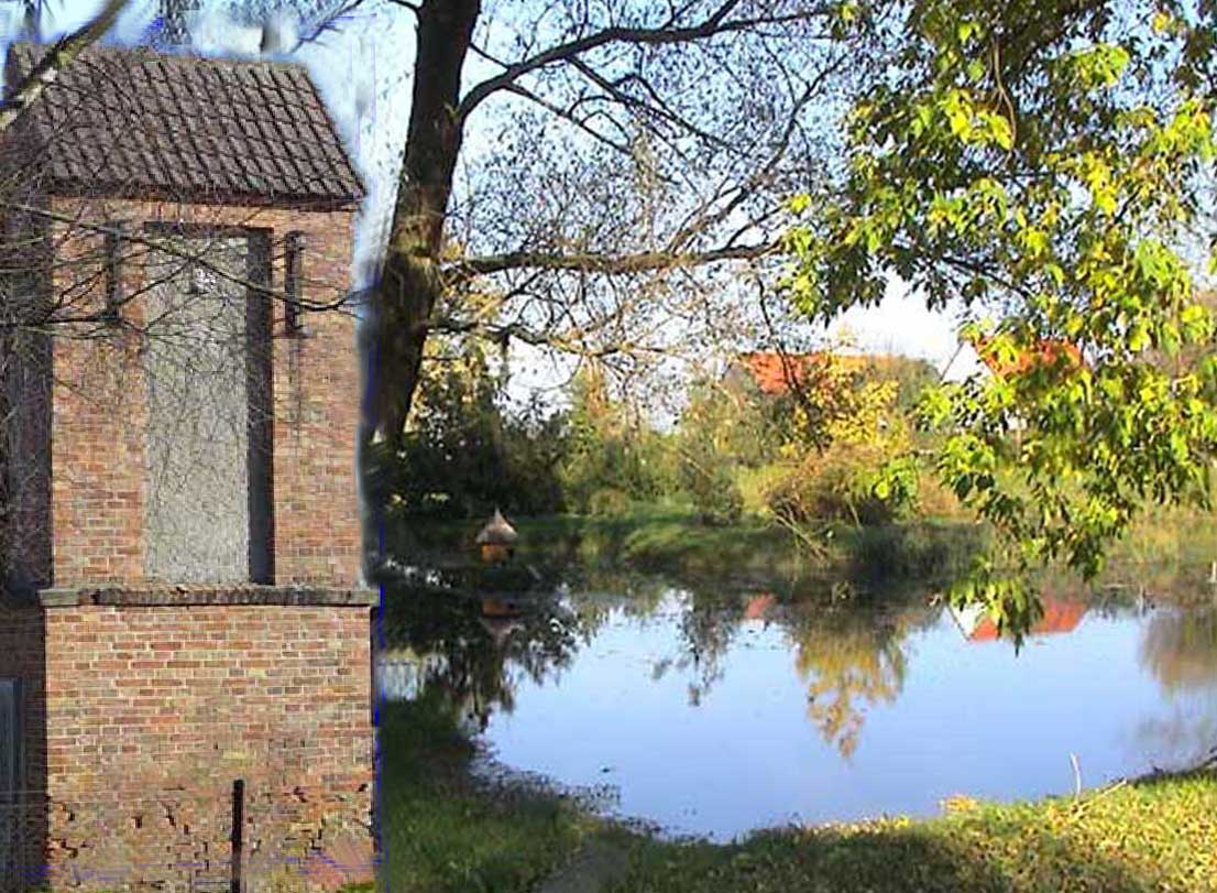 sanft die Ufer und in der Mitte das Häuschen für die Enten als Friede in allen Hütten und über den Wassern auch.