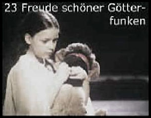 Am Anfang des Hitler genannten Films stand ein Puppenspiel im Hause mit H. als Kasper , Gretl als Eva B. Goebbels als Teufel, das Kind-die Tochter- lachte und verstand nur komische Dinge, und dass etwas unheimlich war darin. Am Ende trug sie den Kasper mit dem Gesicht des H. selbst zu Beethovens Götterfunken und Freude der Freiheitsfanfare aus dem Fidelio in den Sieg. Über den, zu dem sie gar nicht mehr lachte.