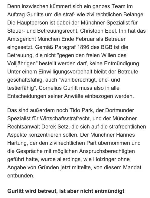 Einer der Gurlitt-Anwälte, Dr. Hannes Hartung, der bislang für die Gespräche mit Anspruchstellern zuständig war, wurde mit sofortiger Wirkung von sämtlichen Aufgaben des Mandats entbunden. Das erklärte Holzinger am Abend ohne Angabe von Gründen.