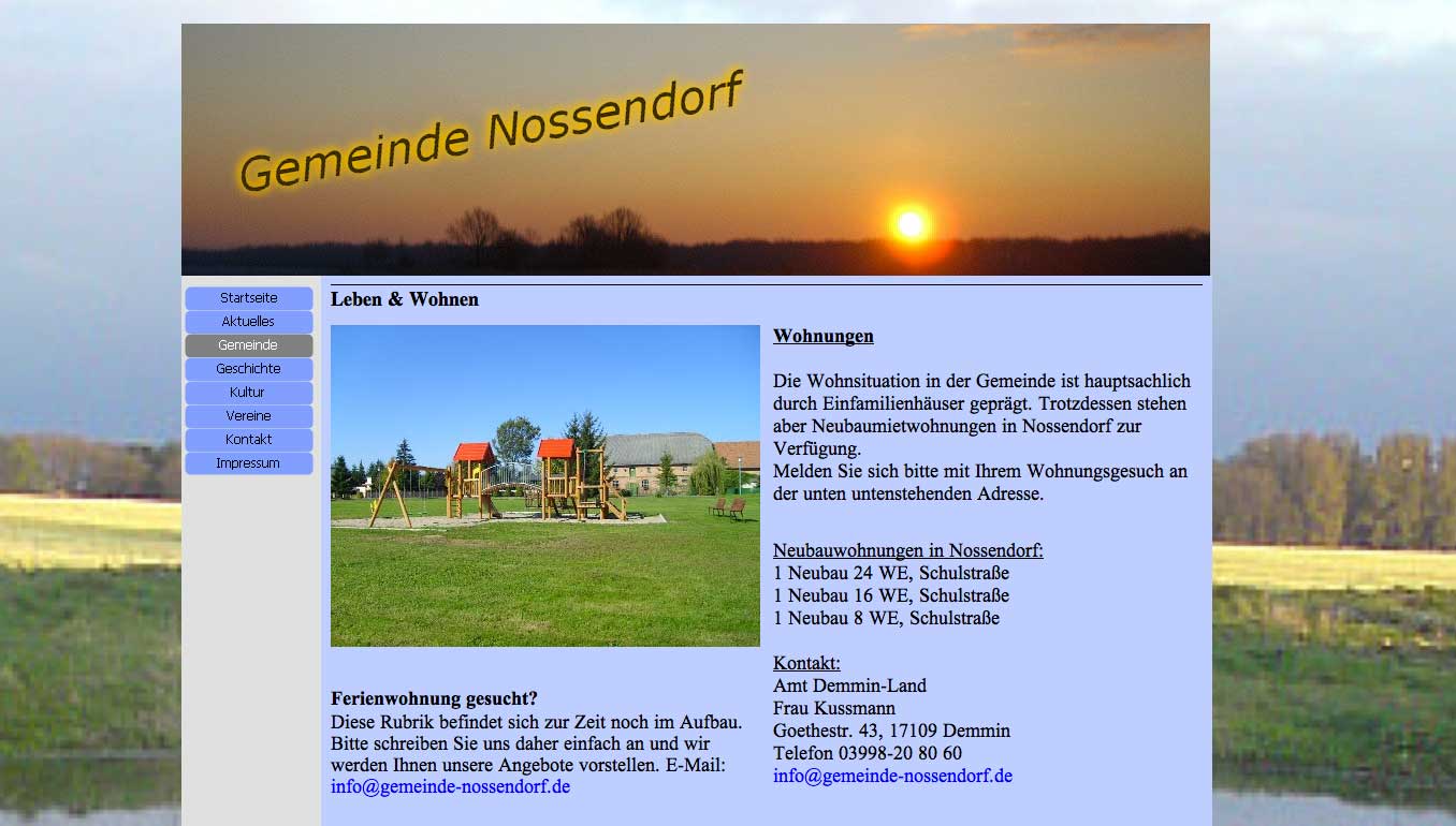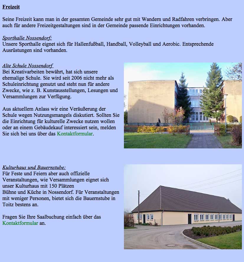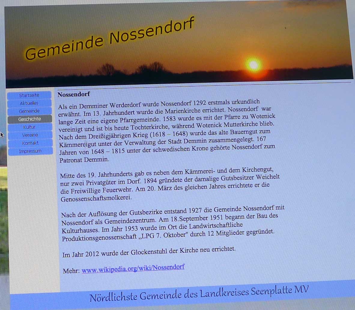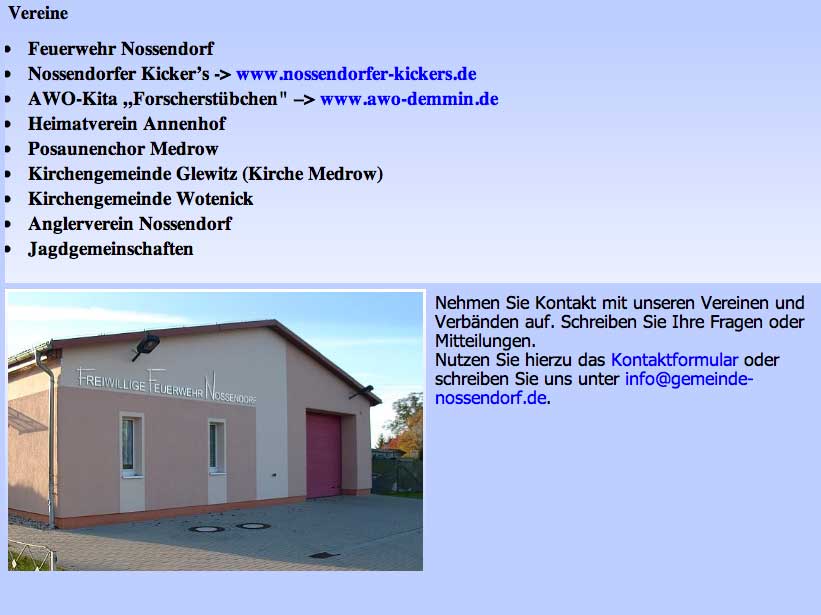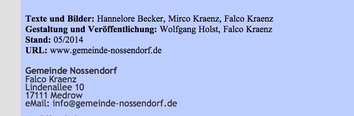 Was hier ausgegeben wird, ist als offizielle Seite unter Namen Gemeinde Nossendorf nicht nur ein schlechter Ausweis des Ortes, entweder Missbrauch des Namens, wenn private Initiative, oder als Organ der Gemeinschaft N.mit Grusswort des bisherigen Bürgermeisters nicht auf aktuellem Stand und irreführend und schädlich. Mit Folgen nach innen wie aussen.