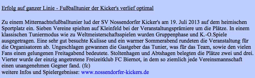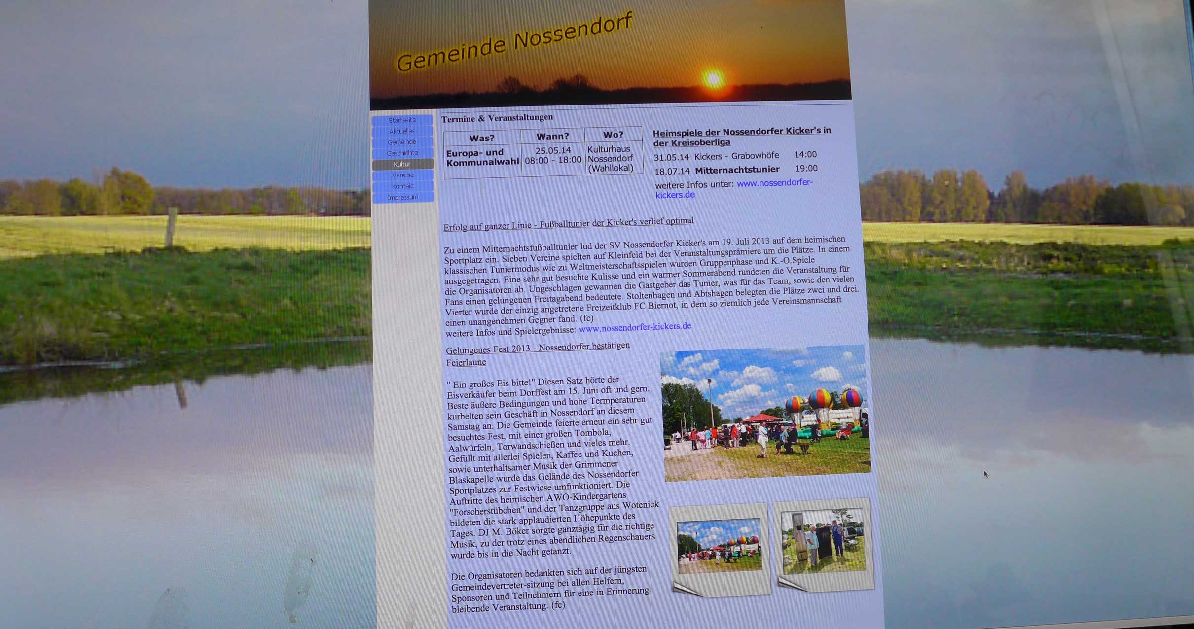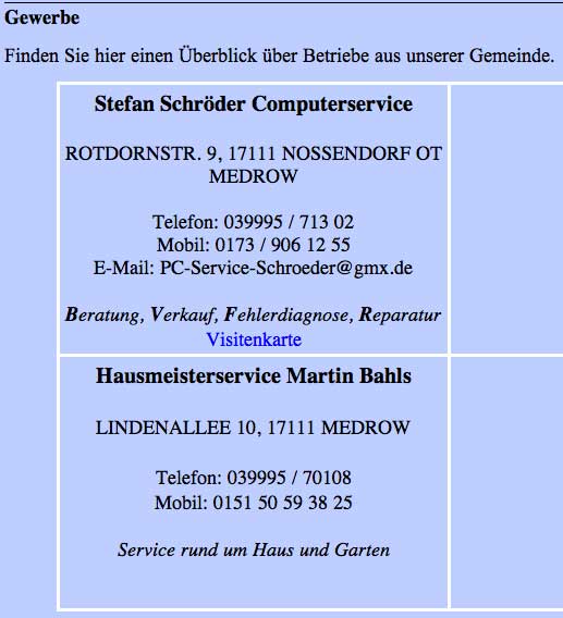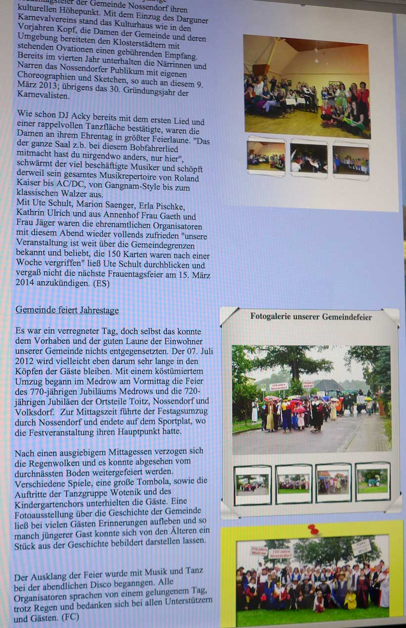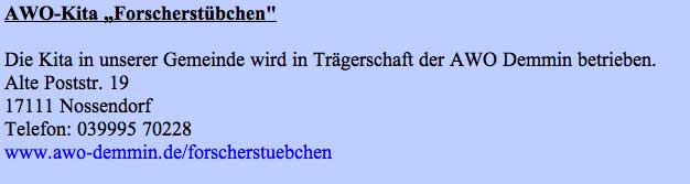 Was hier ausgegeben wird, ist als offizielle Seite unter Namen Gemeinde Nossendorf nicht nur ein schlechter Ausweis des Ortes, entweder Missbrauch des Namens, wenn private Initiative, oder als Organ der Gemeinschaft N.mit Grusswort des bisherigen Bürgermeisters nicht auf aktuellem Stand und irreführend und schädlich. Mit Folgen nach innen wie aussen.