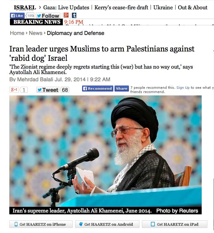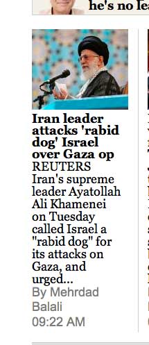 REUTERS Ñ Iran's supreme leader Ayatollah Ali Khamenei on Tuesday called Israel a "rabid dog" for its attacks on Gaza, and urged Muslims to arm Palestinians to enable them to counter what he termed genocide.