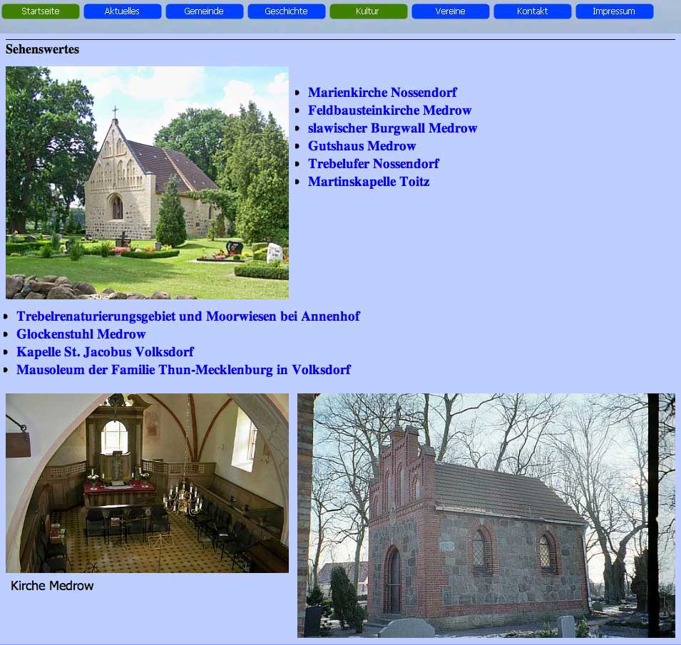 In der Nossendorf genannten Gemeinde von 5 Dörfern gibt es nur eine Kirche mit einem Turm -jetzt wieder wie früher. Der Turm verhiess ihre Bedeutung und Auszeichnung, in Grösse und Programm neben den Kapellen rundum. Die Bedeutung übertrug sich in Zeien der DDR auf die zentrale Lage der Schule für alle mit Nebenbauten im Plattenbau. Das Fällen des Turms 1979/80 war ein Angriff auf die christliche Dominaz der Kultur. Heute fortgesetzt durch die Eliminierung im Internet, zuerst des Turms und so auch weiterhin und in der Platzierung nicht neben oder vor den Kapellen, sondern durch Links verbunden auf anderer Ebene dem ersten und vergleichenden ersten Blick verborgen. Die Felder Nossendorfs werden heute von den ehemaligen LPG-Stationen in den Nachbardörfern bewirtschaftet. In Nossendorf aber ist der Kindergarten als Kindertagesstätte (Kita)im ehehemaligen Gutshaus (Hamann), dort wohnt der Land-Arzt und das wiederhergestellte Gut(Syberberg) hat seinen weitreichenden Platz im Netz der Welt mit Nachrichten aus Nossendorf mit Nachrichten vom und um den Turm der wiederhergestellten Kirche auch im Inneren. In der öffentlichen Präsenz der Gemeinde und des Amtes Demmin und damit des Kreises gemieden und so auch alle Hinweise auf Kultur wieder jenseits von Fussballnachrichten des Ortes (N-Kickers) und Rentenertreffen zu Weihnachten im "Kulturhaus" mit Dämmungsinvestionen als Massnahme der Post-LPG Normenklatur.