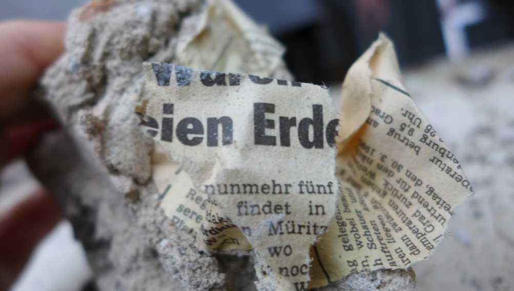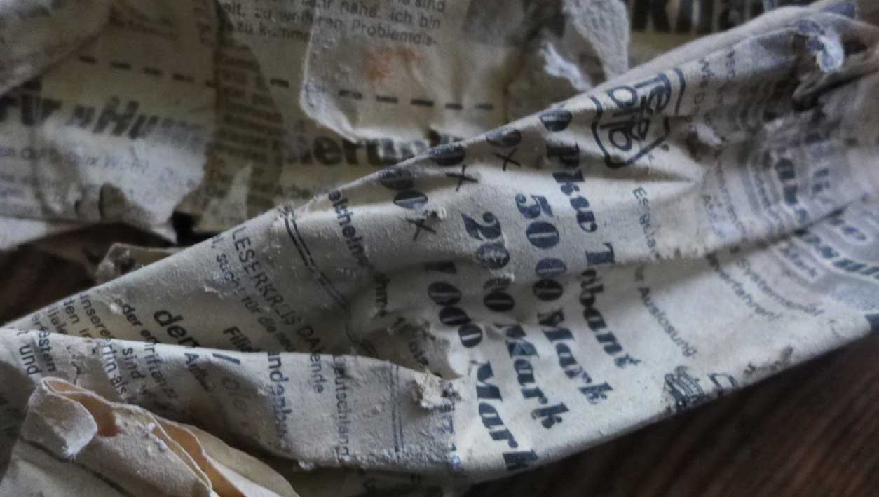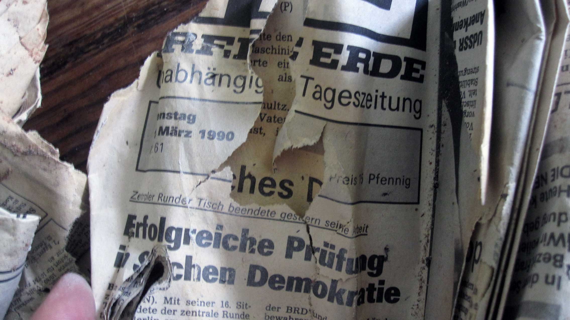 und die Zeitungen im Futter zwischen Wand und Fenster die Zeitungen sind von 1990, also nach der Wende noch ernert, aber im Stil und Material der LPG, Beschläge, die nicht zu öffnen waren. Wohin das Geld ging, und was die ersten Wünsche waren, weg die alten Fenster. Vor 45.