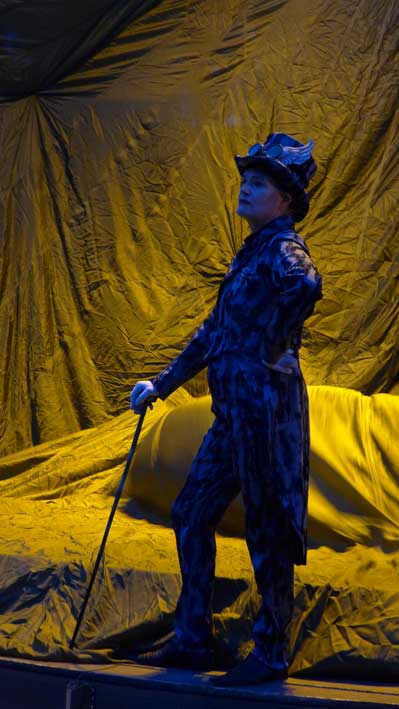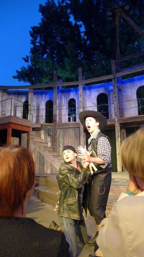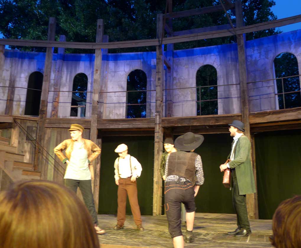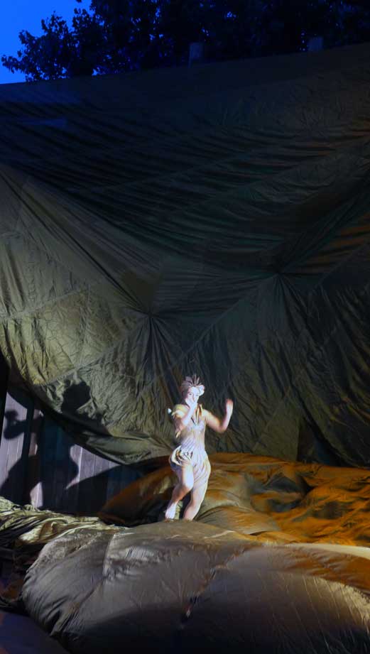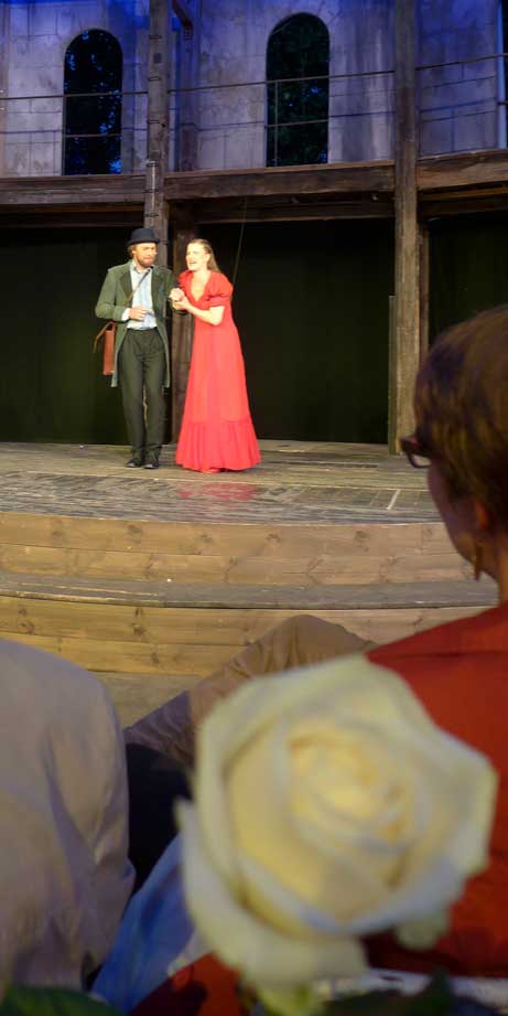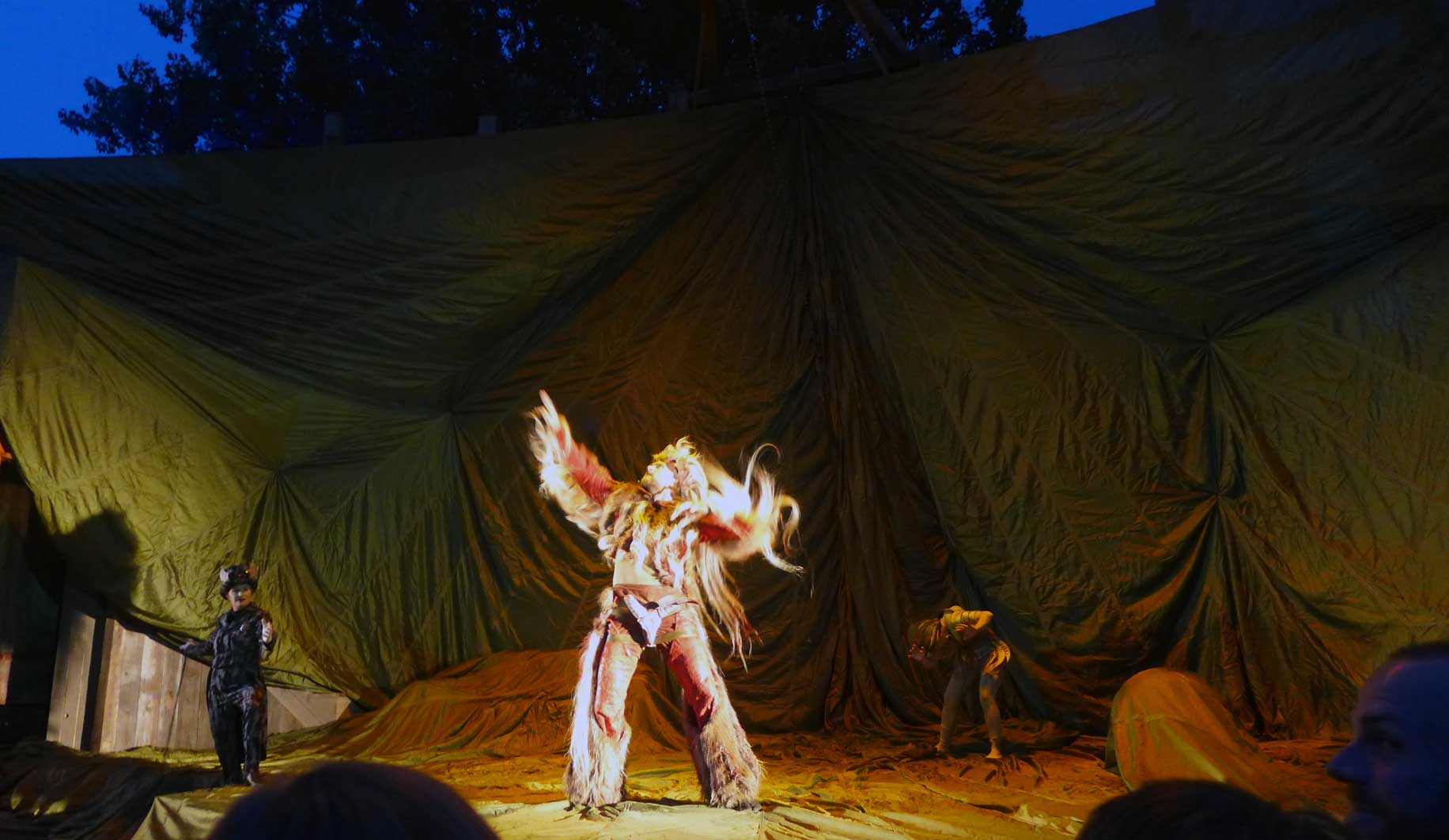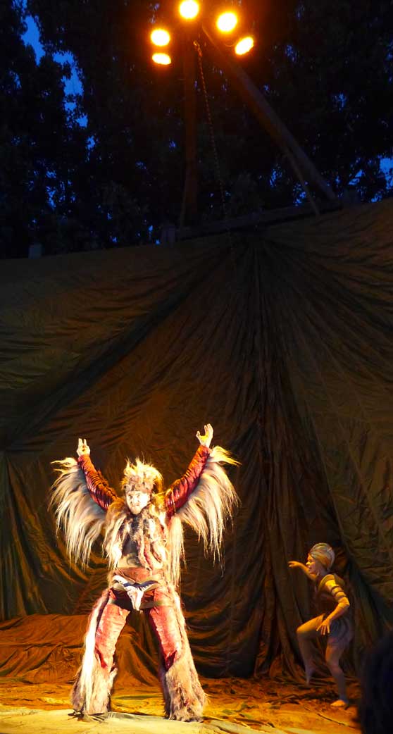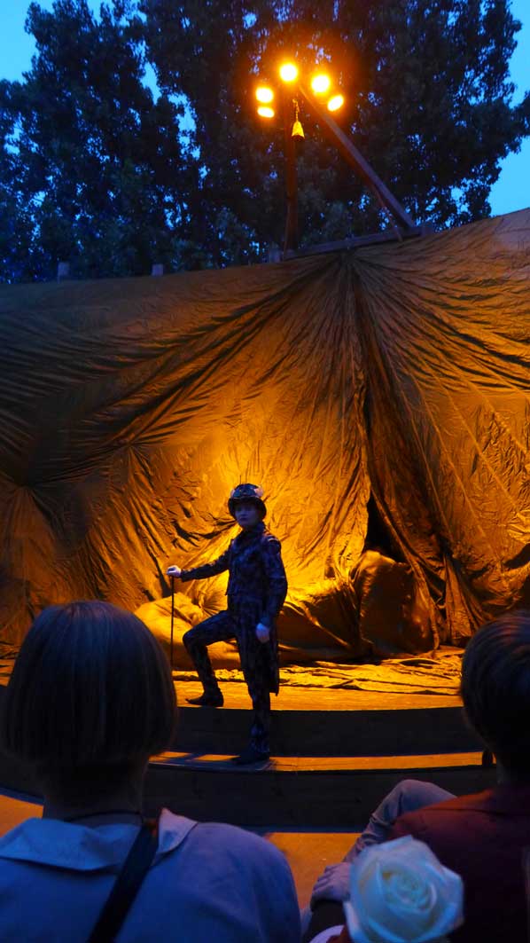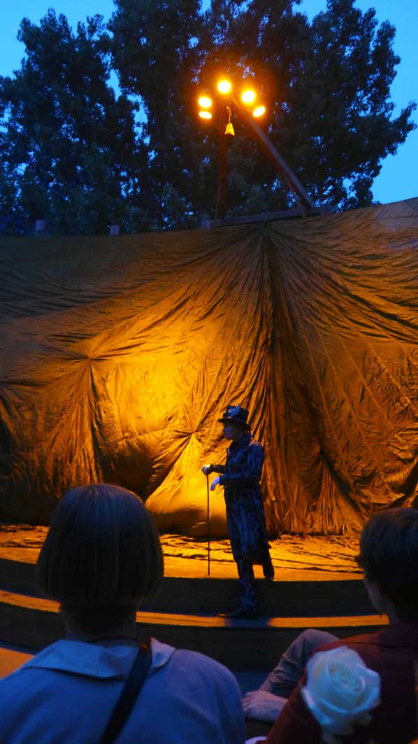folgen wir einfach der Musik der Bewegung von Figuren mit Lichtwechseln und Farben der Kostüme ohne Text in der Reihenfolge wie wir es sahen an diesem Abend. Das Auf und Ab der Liebenden mit Träunen und Lachen an diesem geweihten Ort. der eben noch ein Un-Ort war. von einer eingespieltenTruppe nach ihren Ritualen,