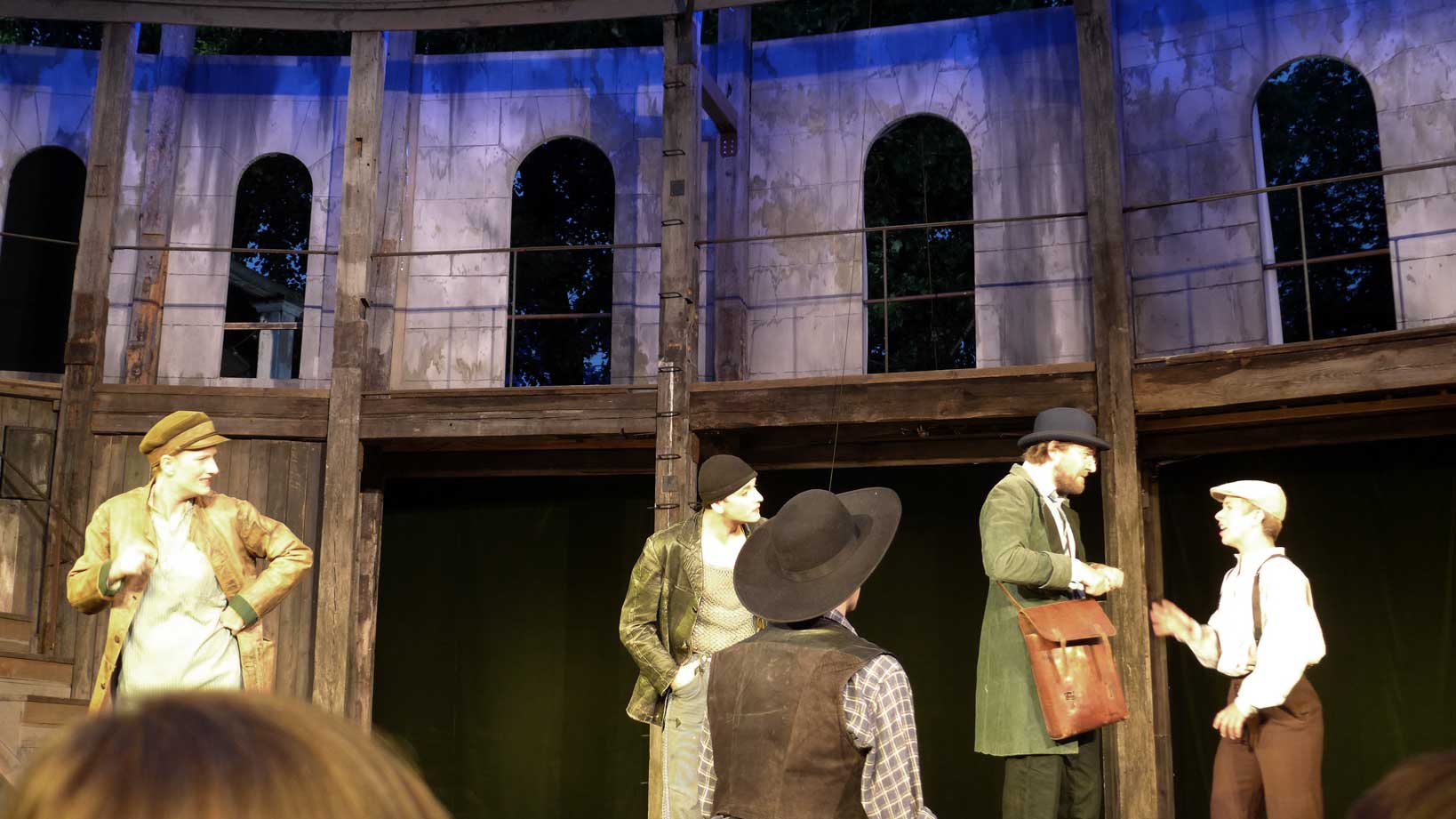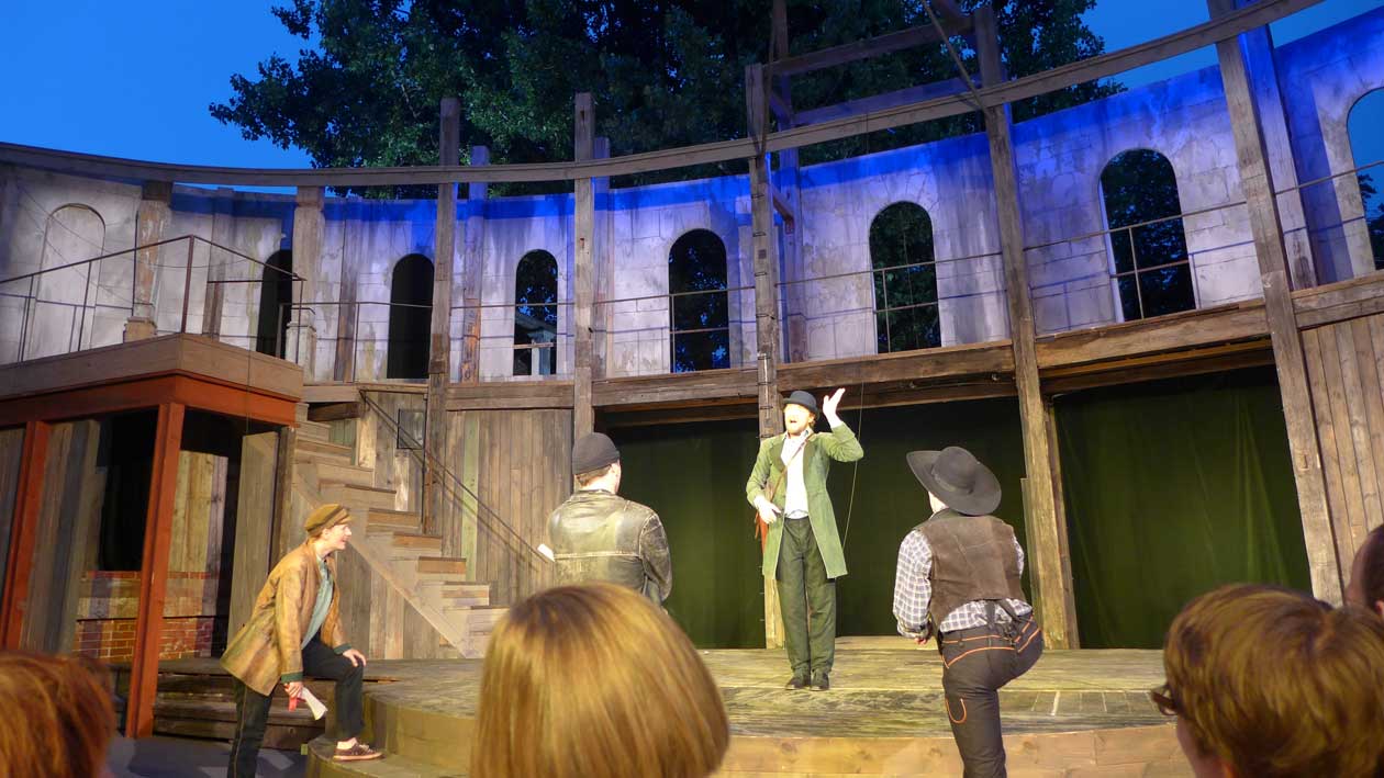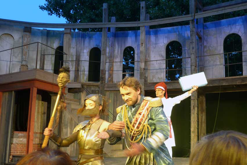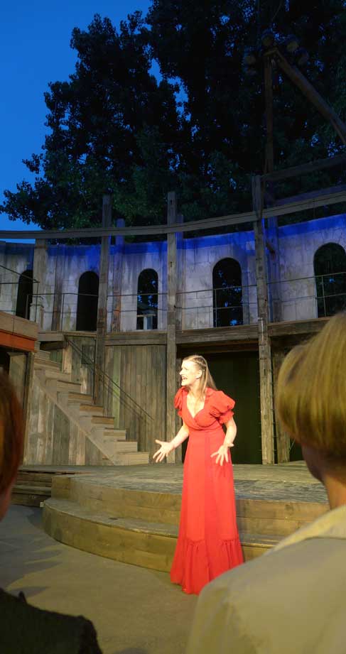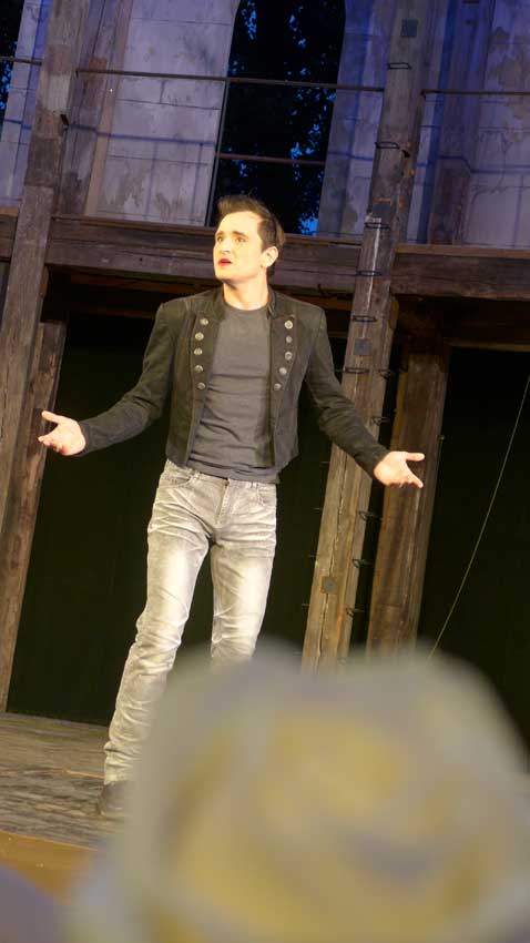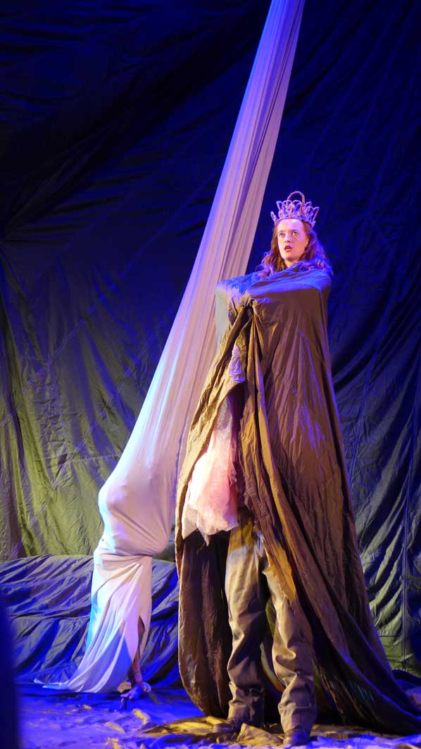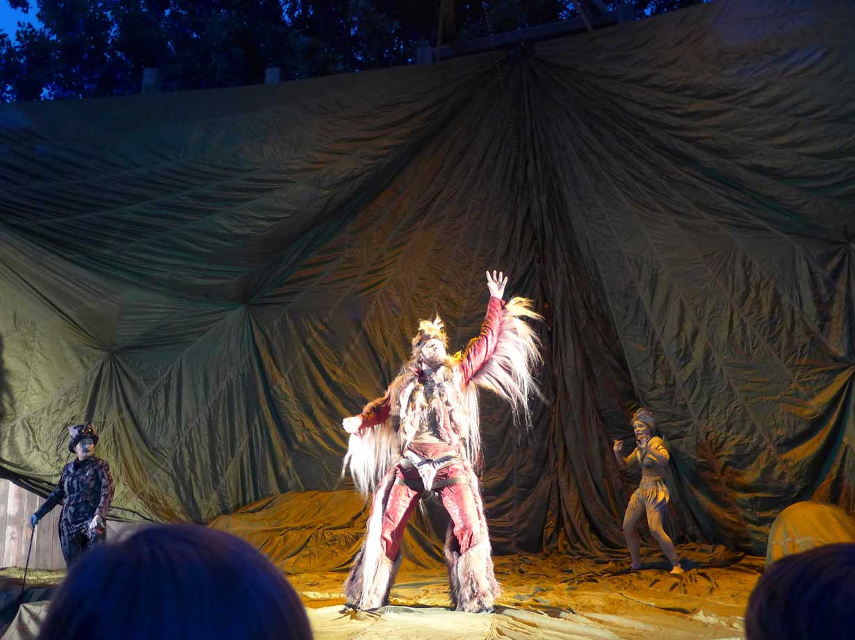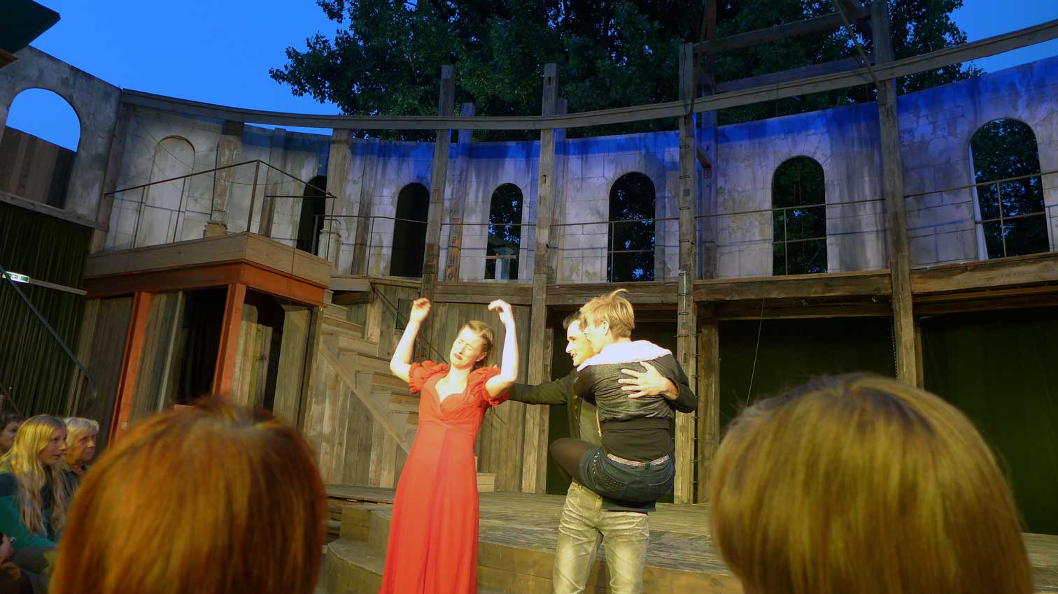 folgen wir einfach der Musik der Bewegung von Figuren mit Lichtwechseln und Farben der Kostüme ohne Text in der Reihenfolge wie wir es sahen an diesem Abend. Das Auf und Ab der Liebenden mit Träunen und Lachen an diesem geweihten Ort. der eben noch ein Un-Ort war. von einer eingespieltenTruppe nach ihren Ritualen,