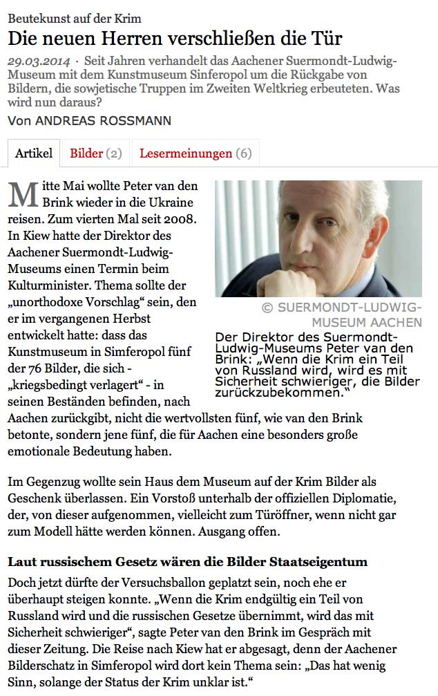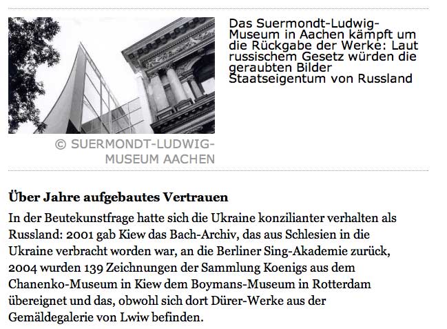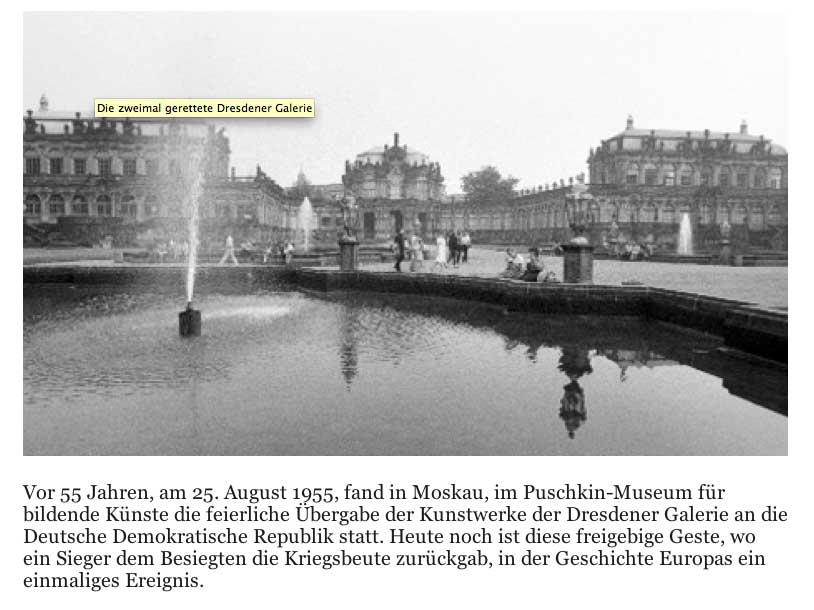 Mehr Geld also und Bemühungen für die Heimholung im Kriege verlorener Kunstwerke oder deren Unterstützung an anderen Orten, wenn sie es brauchen, mit Dank, wenn sie noch da sind und vielleicht manchmal wieder hier dann, nicht aber dafür sie wegzugeben, aus Landes und auf die Märkte der Welt, zu vertreuen was hier entstand und hierher gehört. Unabhängig vom aktuellen Besitzstand. Das solange wir die Macht und daraus den Auftrag haben dafür zu sorgen: wie.