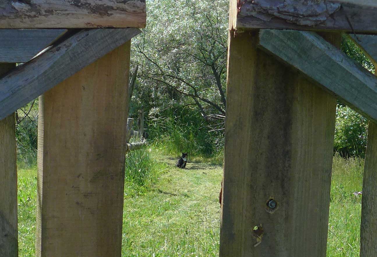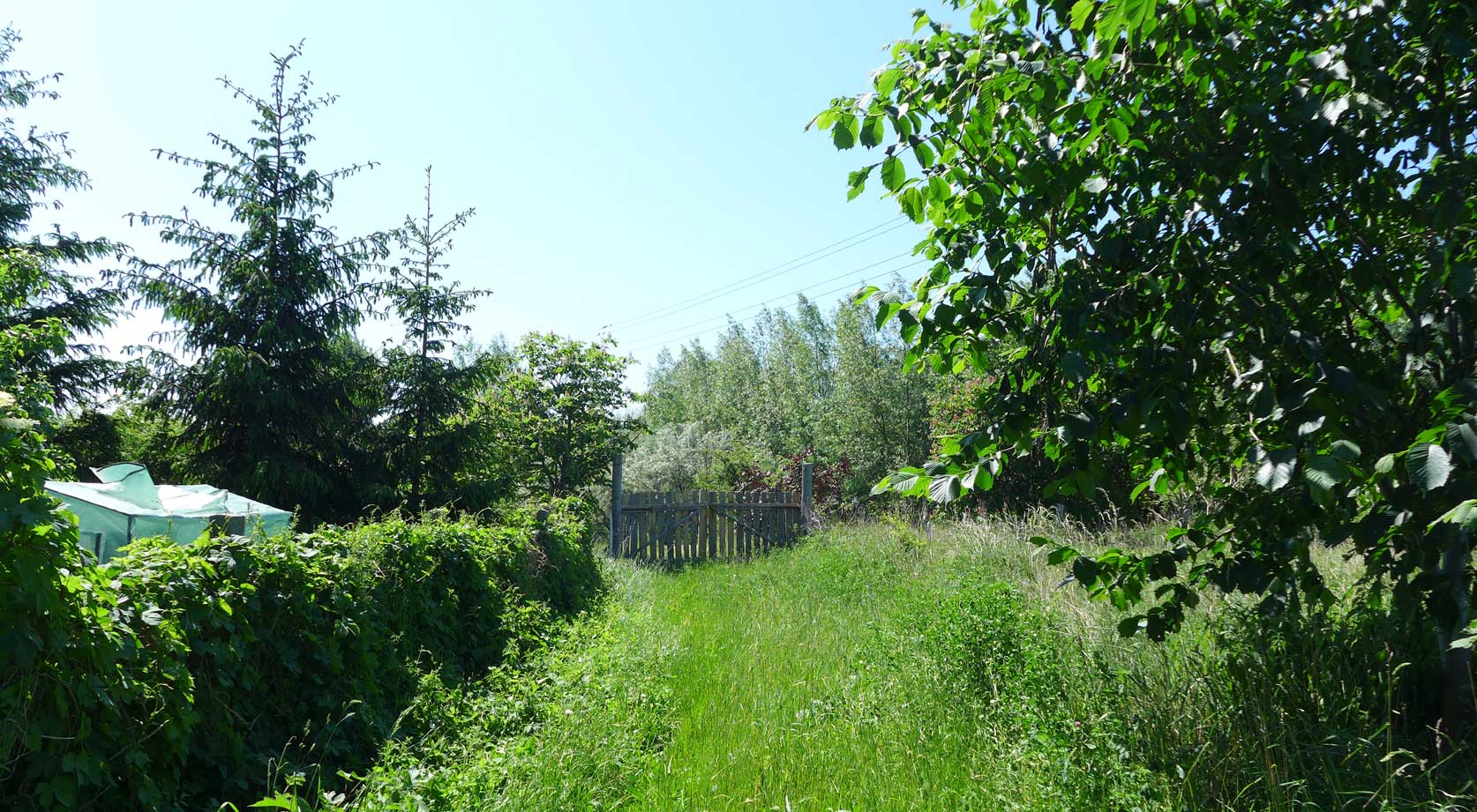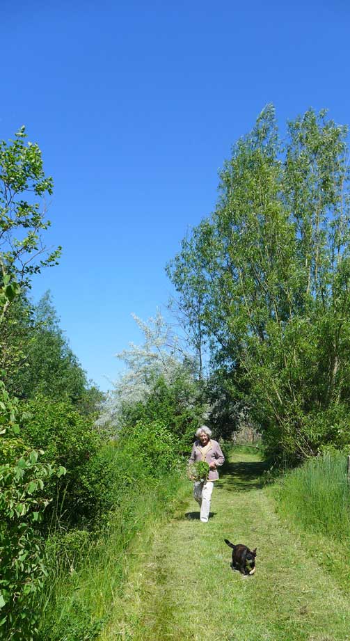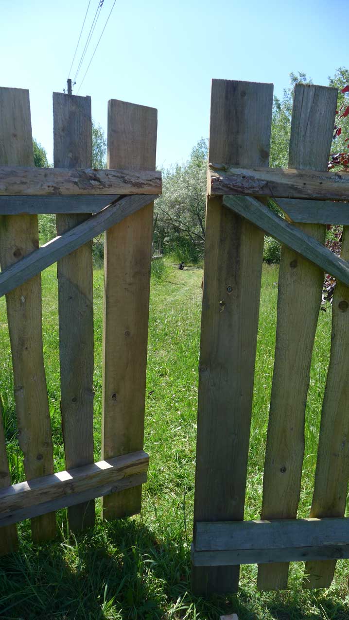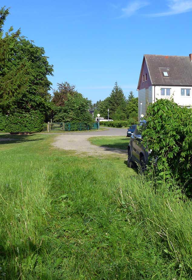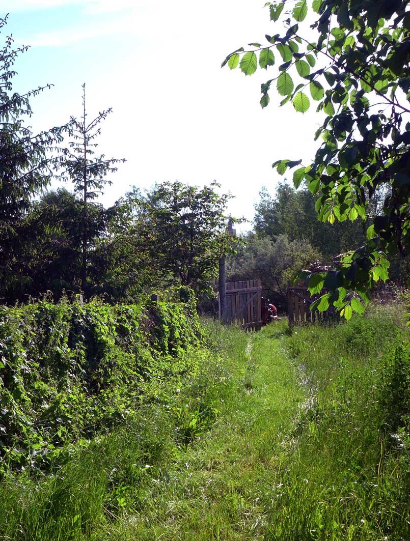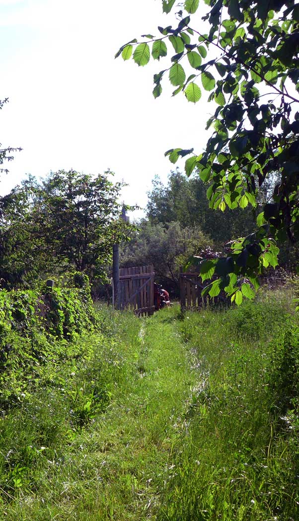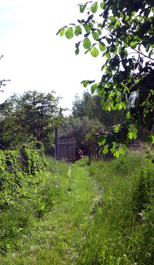 schnell nochmal zurück den Weg mähen, selbst, auf der anderen Seite, zum Tor, wir kommen wieder.