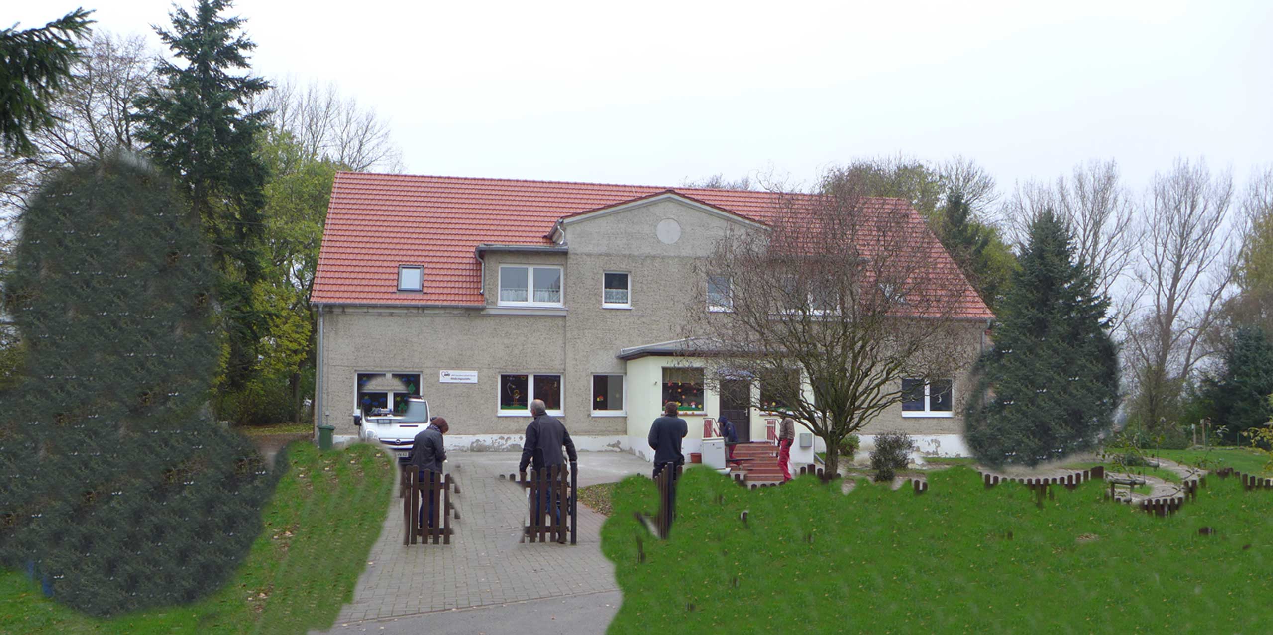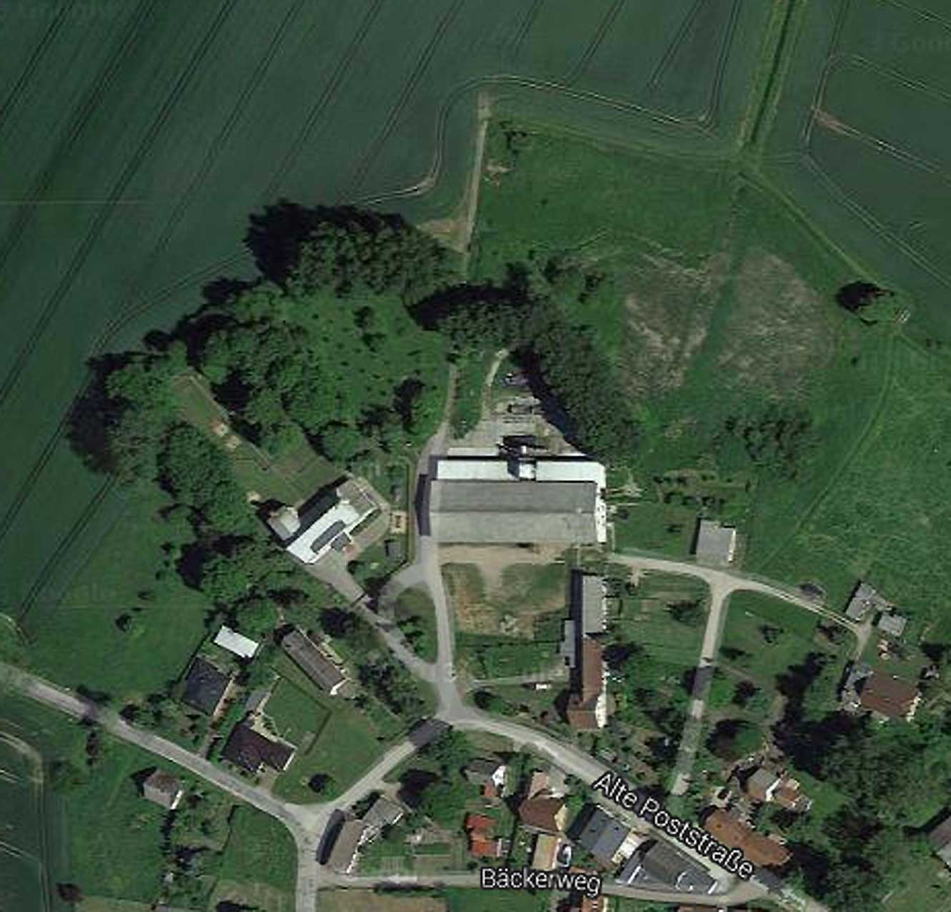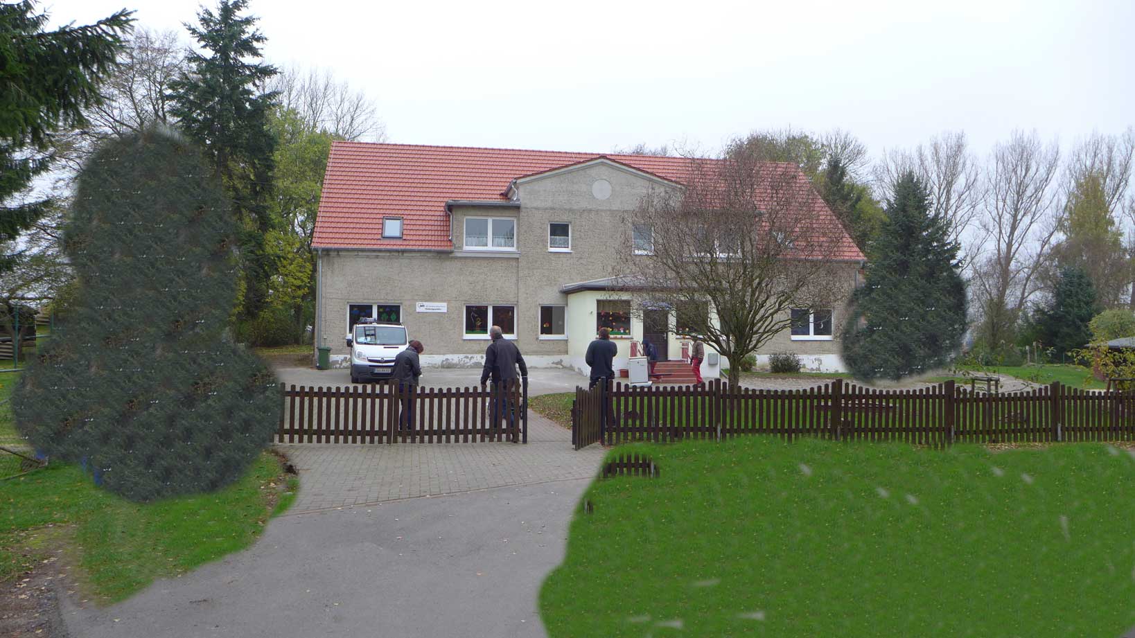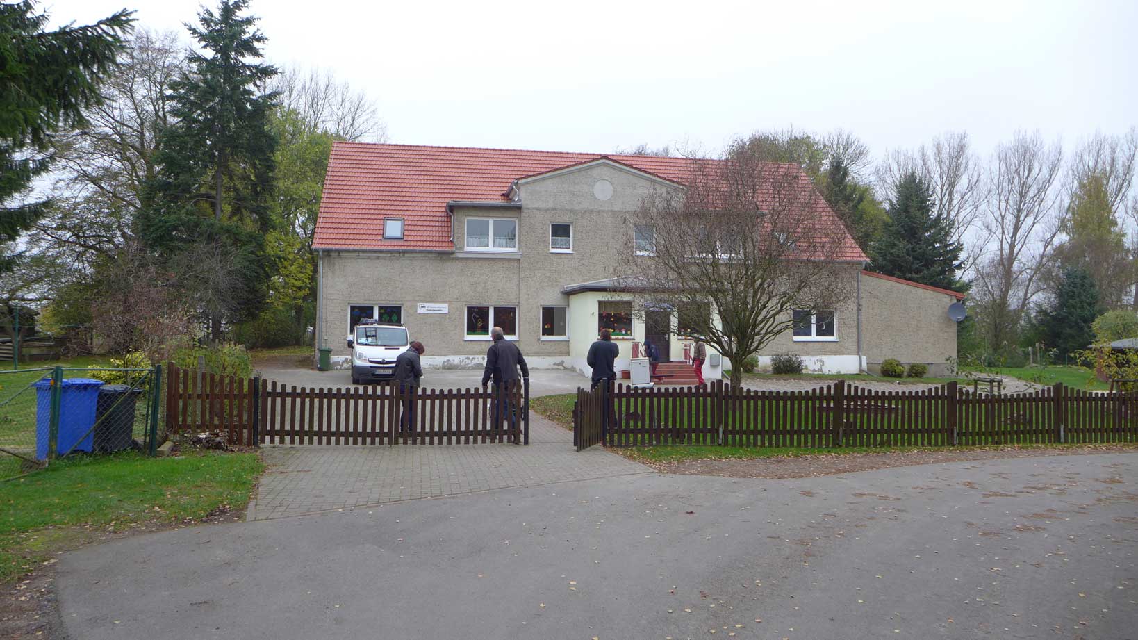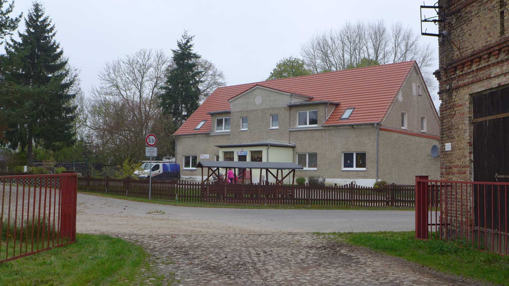 So sahen die Gutshäuser in der DDR aus, wenn sie zu Nutzbauten des Sozialistischen Realismus umgewidmet wurden. Mit Erweiterungen von Wohnungen oben, damals für Lehrkörper der Schule, heute seit langem leerstehend und trotzdem mit öffentlichen Mitteln subventionierter Ausbau. Ein Fall für den Rechnungshof, wenns rauskäme. Die obligaten Zäune, damit die Kinder von Anfang an ihre Grenzen und Mauern kennen. Die letzte Fassung vor diesem teuren Umbau nur des Daches sollten wir vergessen-aber eben ganz.